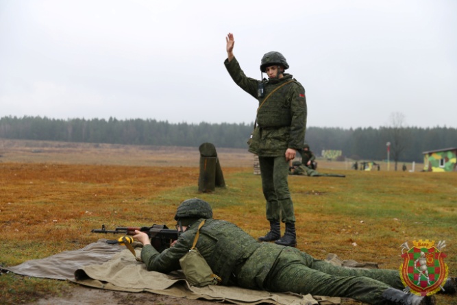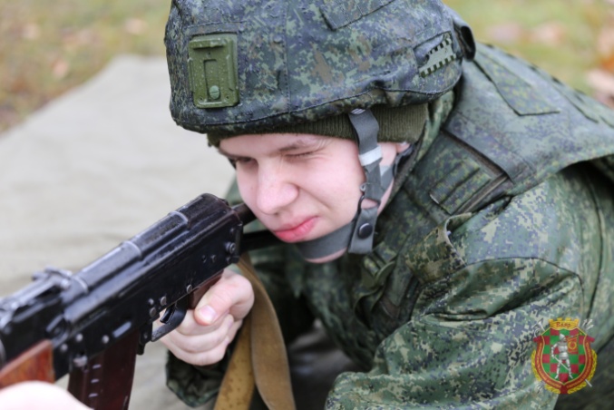 В рамках курса начальной военной подготовки военнослужащие нового пополнения Минской военной комендатуры на полигоне 120-й омбр выполняют упражнение начальных стрельб из автомата Калашникова. По условиям выполнения упражнения им необходимо поразить две мишени на дальностях сто и двести метров одиночными выстрелами.