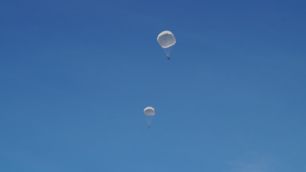 В тот день прыжки совершали уже опытные военнослужащие, поэтому высота десантирования была 600 метров. Когда нужная высота набрана, все максимально сосредоточены: желтый сигнал – приготовиться, зеленый сигнал – пошел, выпускающий дает команду, и в небе один за одним, начинают раскрываться «одуванчики».