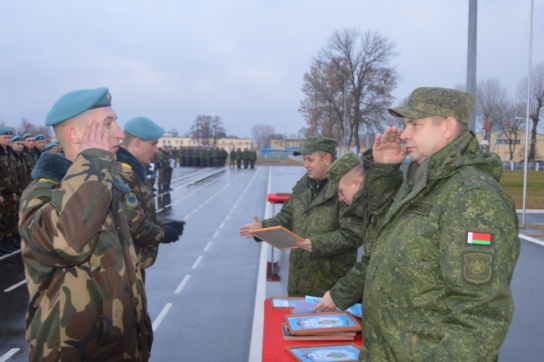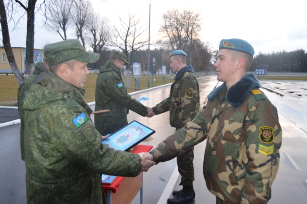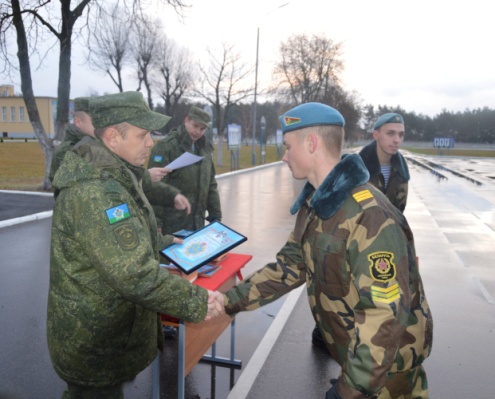 Командир 38 одшбр гвардии полковник Александр Ильюкевич поблагодарил солдат за службу. За образцовое исполнение обязанностей военнослужащим были вручены фотографии при развернутом Боевом Знамени воинской части, грамоты и благодарственные письма.