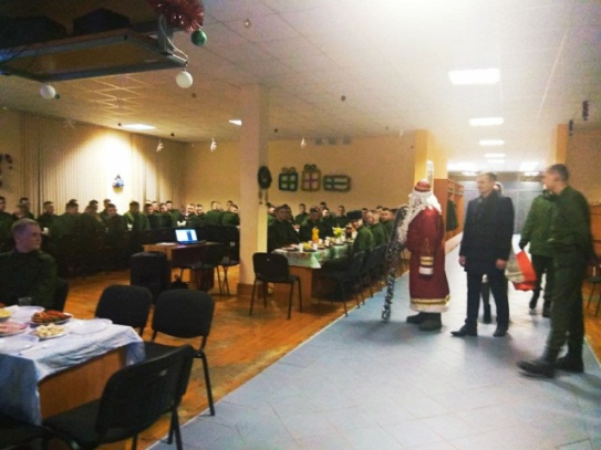 Военный комендант Минской военной комендатуры подполковник Дмитрий Жуковский вместе с Дедом Морозом и Снегурочкой перед самым Новым годом поздравили военнослужащих срочной службы комендантского батальона.
