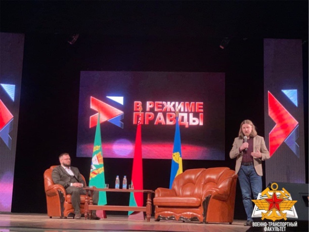 В Городском центре культуры города Гомеля прошел открытый диалог под названием «В режиме правды» с политическим обозревателем Алексеем Дзермантом. В нем приняли участие курсанты военно-транспортного факультета в БелГУТ.