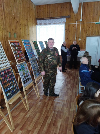 Подполковник в отставке Станислав Альшевский, который также является руководителем по военно-патриотическому воспитанию гимназии № 1 имени В.А. Короля г. Червеня, продемонстрировал часть своей личной коллекции медалей и значков, посвященных Вооруженным Силам, Великой Отечественной войне, войне в Афганистане, авиации и космонавтике, которая вызвала повышенный интерес у школьников.