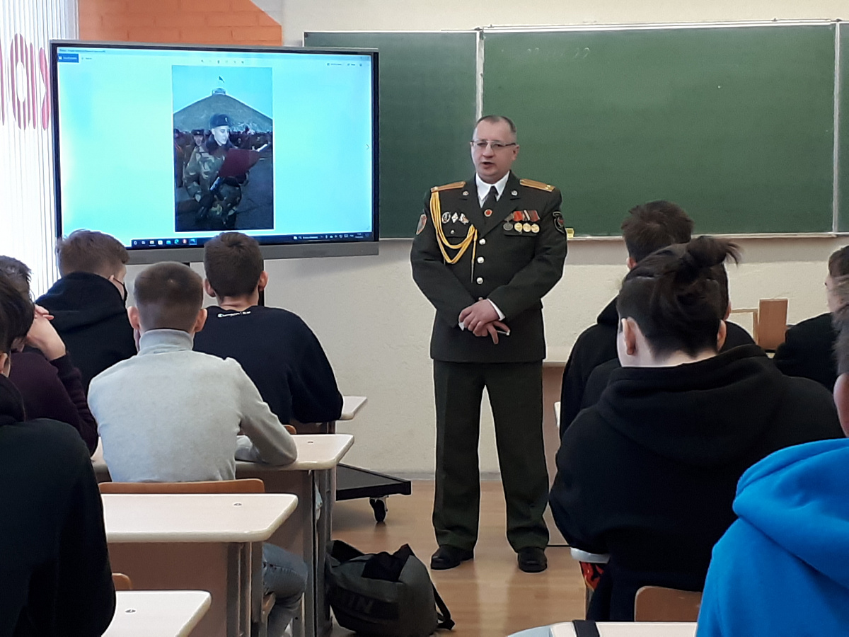 Александр Викторович подробно рассказал о службе солдата в белорусской армии, начиная от призыва, принятия Военной присяги, проведения занятий по боевой подготовке, несения дежурства, участия в учениях и до ритуала чествования военнослужащих, увольняемых в запас. Живой интерес у учащихся вызвали вопросы солдатского быта и досуга.
