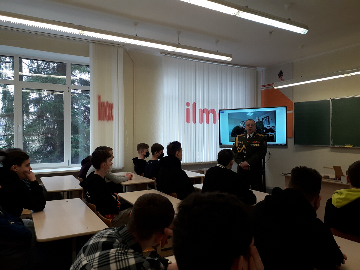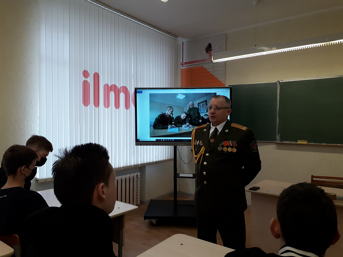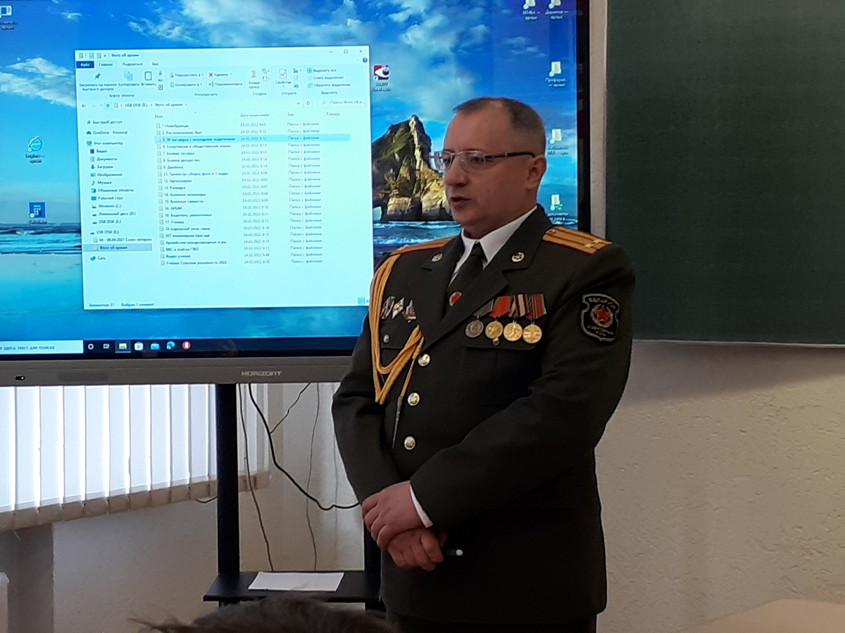 Александр Викторович рассказал учащимся о структуре армии Беларуси: о видах Вооруженных Сил, о родах войск и специальных войсках, о вооружении и военной технике, поделился своими впечатлениями о прошедшем недавно на территории Беларуси совместном белорусско-российском учении «Союзная решимость−2022». Александр Викторович выполнял задачи на Гожском полигоне, где отрабатывались оборонительные действия, контратака, проводились стрельбы. Его рассказ сопровождался многочисленными фотоснимками и видеороликами.
