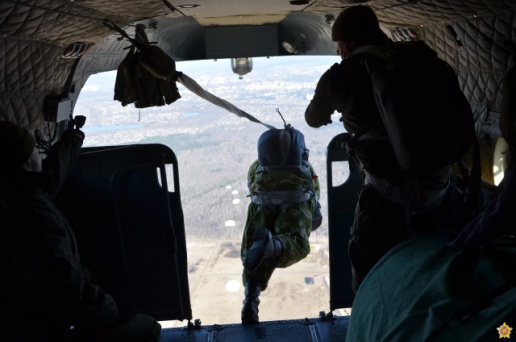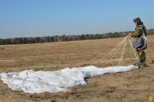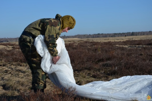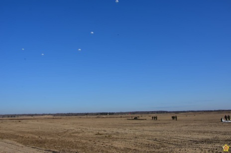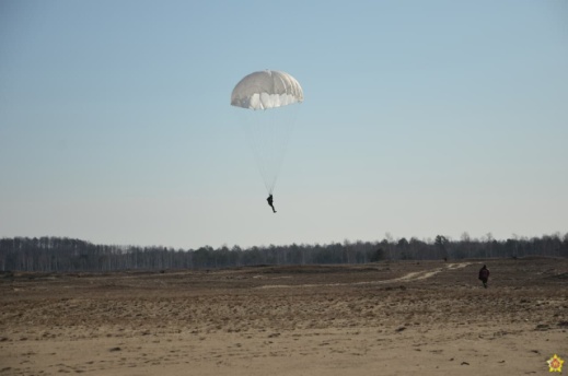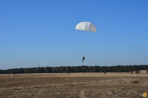 В ходе плановых занятий по боевой подготовке военнослужащие 38-й Брестской отдельной гвардейской десантно-штурмовой бригады совершают прыжки с парашютом на полигоне Брестский.