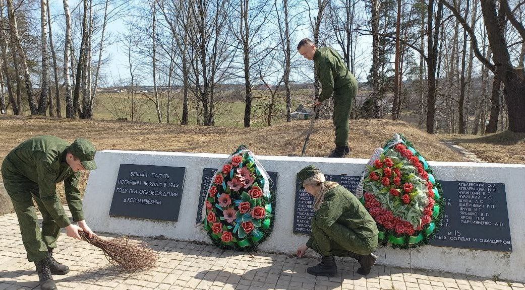 Военнослужащие войсковой части 30151 приняли активное участие в республиканском субботнике. Так одним из объектов работ стала братская могила воинов, погибших в годы Великой Отечественной войны, расположенная возле агрогородка Гатово. В этих местах в 1944 году шли тяжелые бои за освобождение Минщины. Здесь упокоились 287 воинов Рабоче-крестьянской Красной Армии, которые вели бой за освобождение деревни Королищевичи.