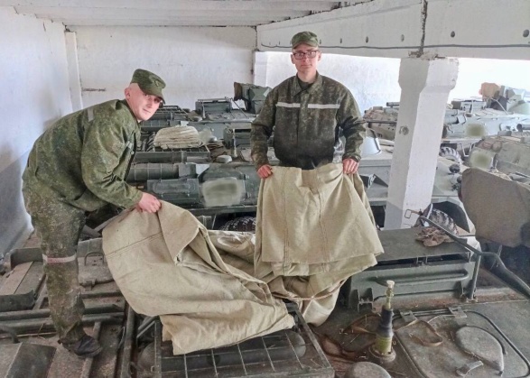 Военнослужащие 339-го отдельного гвардейского механизированного батальона 120-й отдельной гвардейской механизированной бригады вернулись с полевого выхода и приступили к обслуживанию боевых машин БТР-82А.