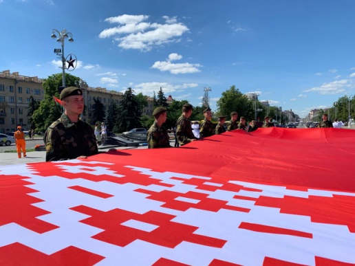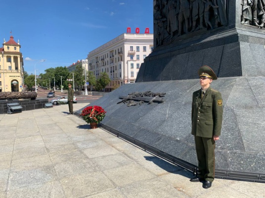 Военнослужащие почтили память героев Великой Отечественной войны, развернули полотнище 20-метрового государственного флага у Вечного огня, организовали почетный караул у монумента Победы.