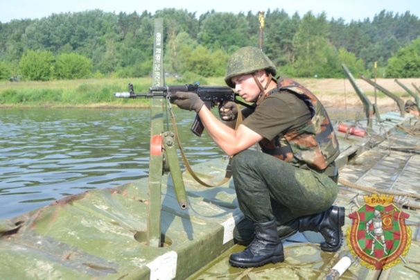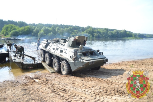На первом этапе учения под огнем условного противника была осуществлена десантная переправа подразделений на плавающем транспортере ПТС-2. Переправу огнем прикрывали бронетранспортеры БТР-82А и минометный расчет. После захвата плацдарма на противоположном берегу был собран взводный паром, на котором через водную преграду участники учения переправили бронетранспортер. Переправа осуществлялась под прикрытием дымов, воины-понтонеры поражали условного противника огнем из стрелкового оружия. Тем временем другое подразделение собрало еще один взводный паром и продолжило переправу бронетехники и грузовых автомобилей через водную преграду.