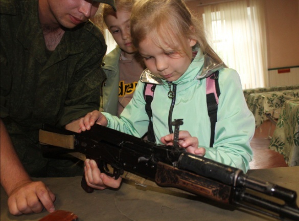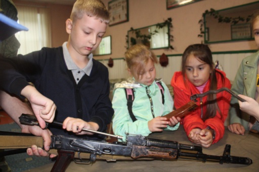 Особый восторг вызвала у ребят возможность потрогать все своими руками, мальчишки и девчонки с огромным удовольствием выстраивались в очередь, чтобы потренироваться в сборке и разборка автомата Калашникова.