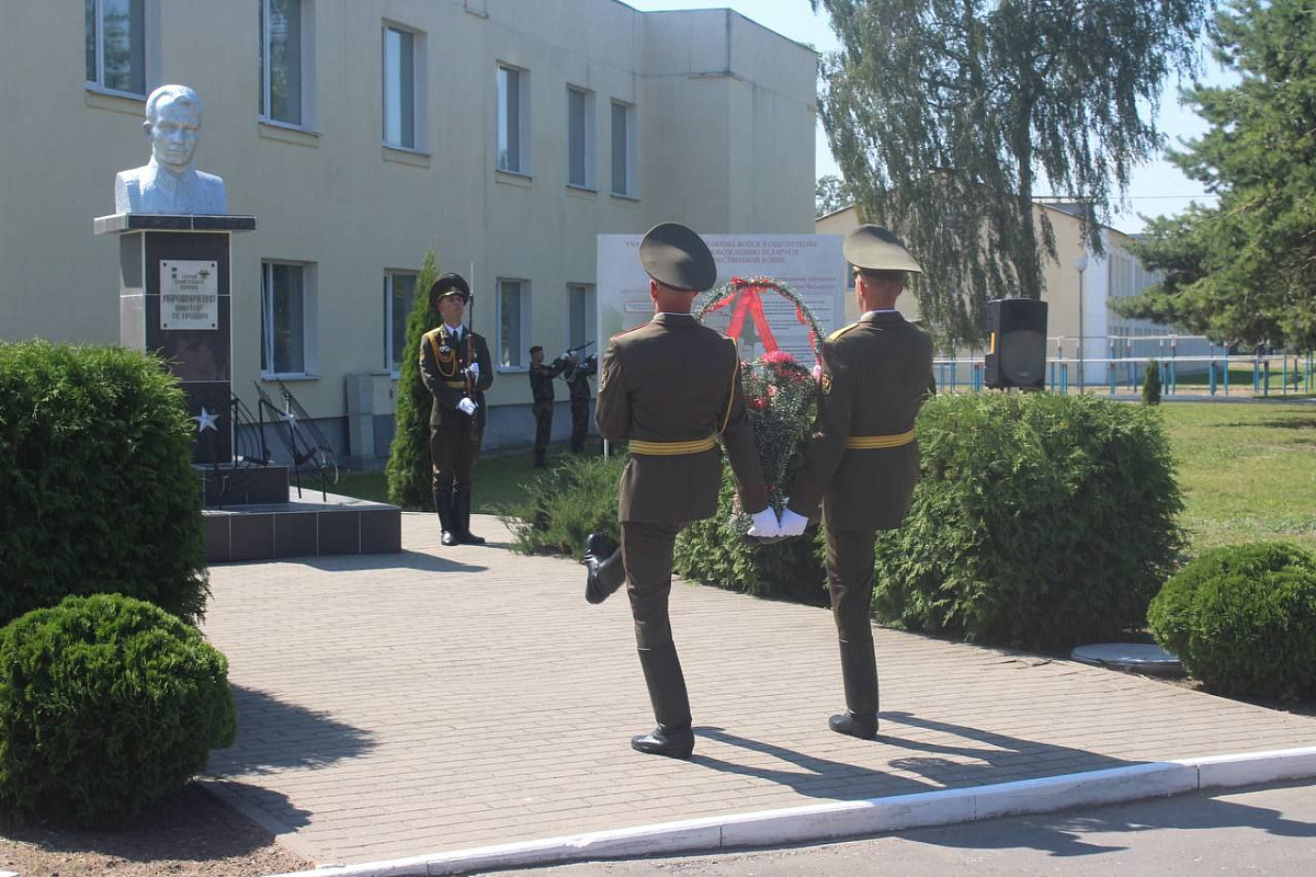 Началось торжественное мероприятие с возложения цветов и венков к расположенному на территории соединения памятнику Герою Советского Союза Виктору Мирошниченко. В годы Великой Отечественной войны сержант Мирошниченко, командир отделения 76-го отдельного строительного путевого железнодорожного батальона, ценой собственной жизни подорвал железнодорожный мост, остановив наступление врага. Память о погибшем герое и сейчас свято хранят воины-железнодорожники.