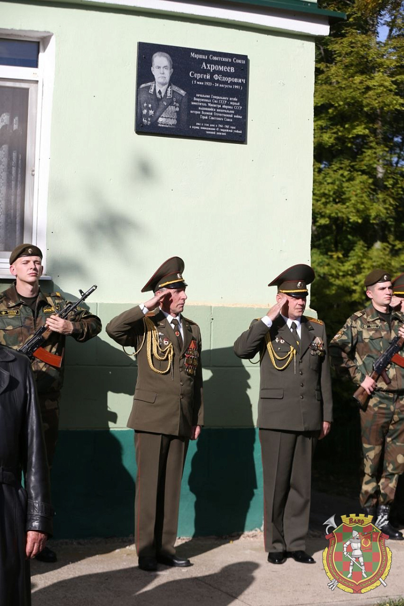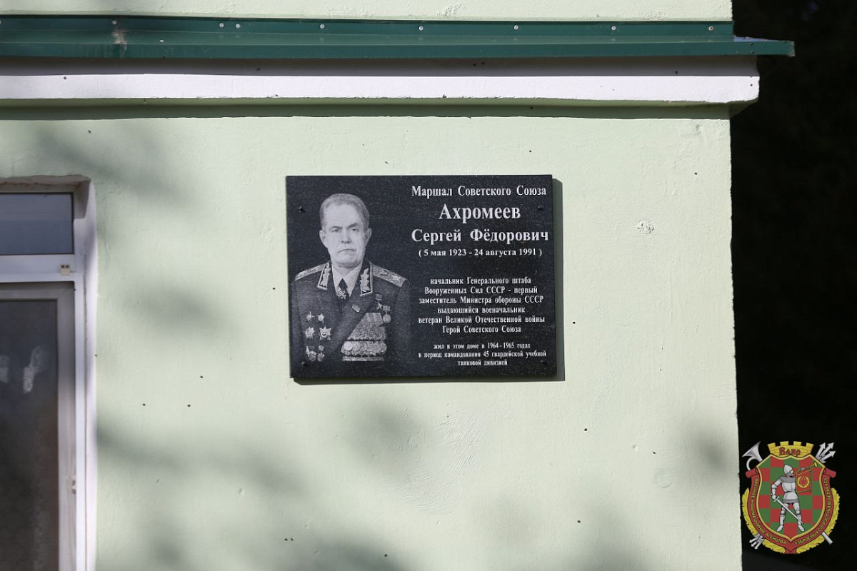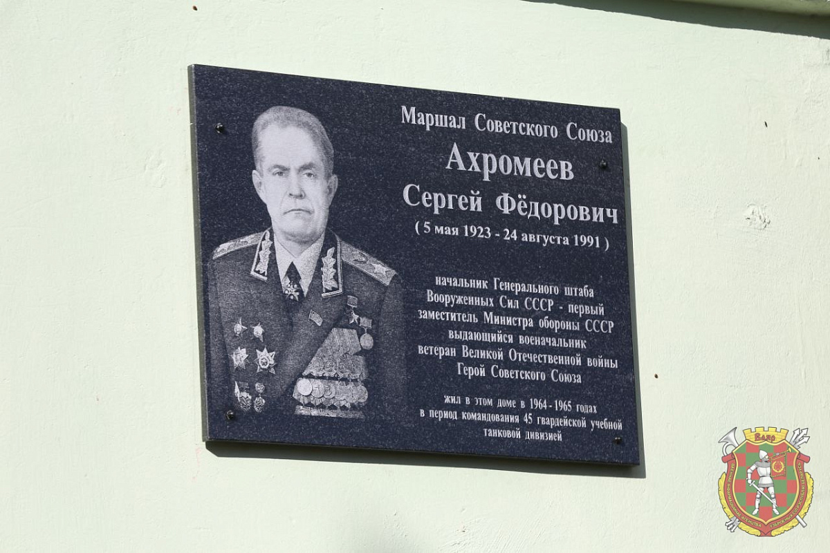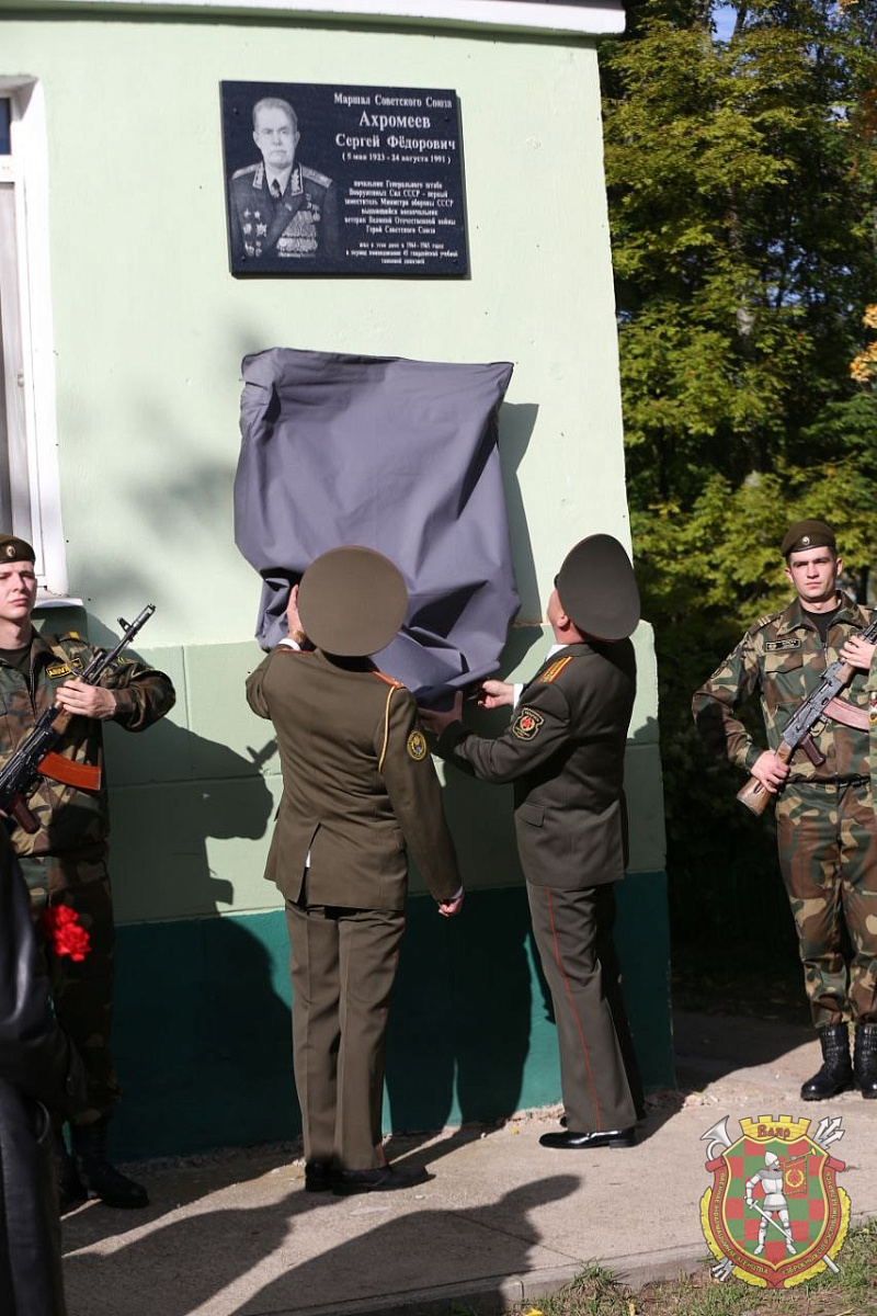 Сегодня в рамках мероприятий празднования 82-й годовщины образования 72-го гвардейского Объединенного учебного центра подготовки прапорщиков и младших специалистов прошла торжественная церемония открытия мемориальной доски в память о Герое Советского Союза, Маршале Советского Союза Сергее Фёдоровиче Ахромееве. Размещена она на доме № 7 на улице Серебренникова в военном городке Печи.
