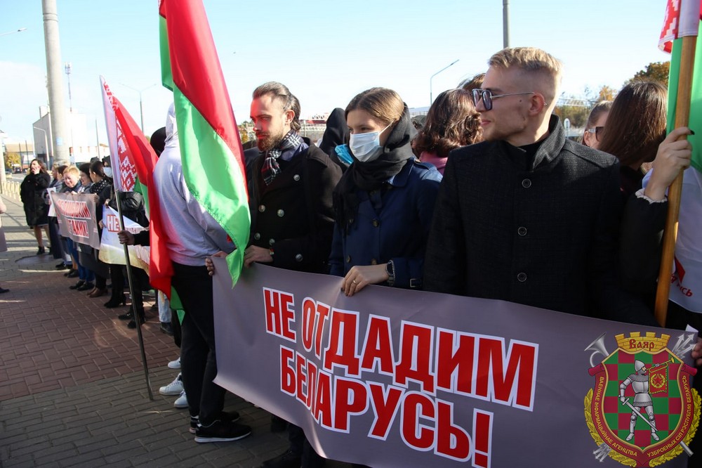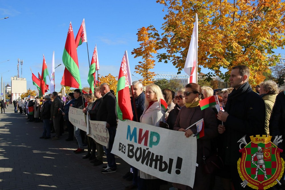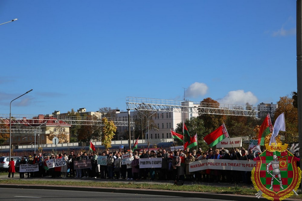 Участники пикета скандировали: «Фашизму — нет! НАТО — нет! Санкциям — нет! Миру — да!», «Миру — мир», «Руки прочь от Беларуси!», «Беларусь не отдадим!», «За Беларусь!».