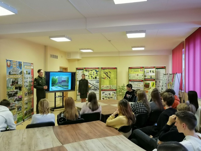 Курсанты, обучающиеся по специальности «Международные отношения в военной сфере» Иван Панков и Ульяна Кручек, познакомили школьников из ГУО «Белорусскоязычная гимназия №2 г. Борисова» со структурой факультета, а также рассказали историю ведущего ВУЗа и одного из лучших военных факультетов по подготовке военных кадров страны.