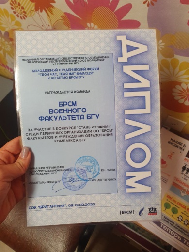 Команда военного факультета в БГУ приняла участие в мероприятии и была награждена дипломом за участие в конкурсе «Стань лучшим!» среди первичных организаций ОО «БРСМ» факультетов и учреждений образования комплекса БГУ.