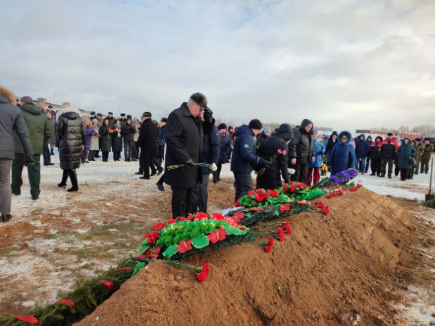 Военнослужащие 11-й отдельной гвардейской механизированной бригады приняли участие в церемонии перезахоронения останков мирных жителей, погибших в годы Великой Отечественной войны в городском поселке Новоельня.