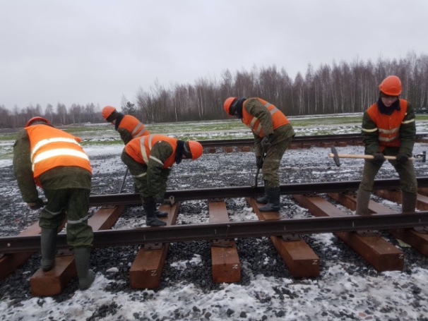 В рамках слаживания отделений на базе учебного центра «Лесище» военнослужащие 77-го отдельного мостового железнодорожного батальона выполнили перешивку пути на деревянных шпалах.