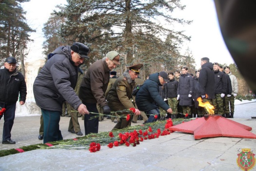 На аллее Героев под звуки военного оркестра состоялась торжественная церемония возложения цветов и гирлянд к Вечному огню.
