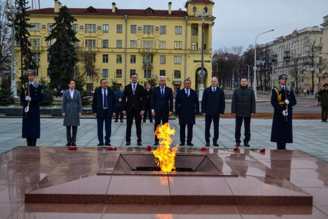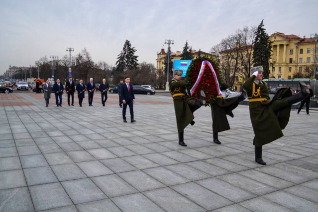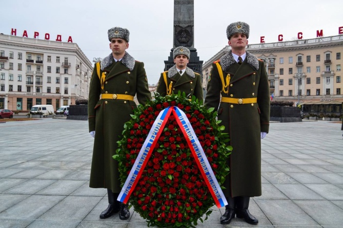 В ходе рабочего визита в Республику Беларусь делегации из Республики Калмыкия Российской Федерации военнослужащие роты почетного караула с главой Республики Калмыкия Хасиковым Бату Сергеевичем возложили венок к монументу Победы.