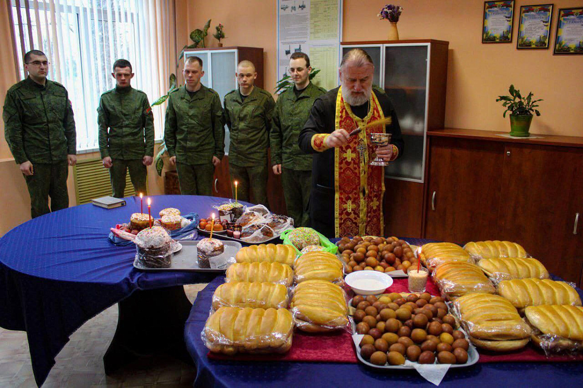 В 83-м инженерно-аэродромном полку настоятель Свято-Георгиевского храма города Бобруйска протоиерей Геннадий Вейго поздравил военнослужащих с Пасхой и освятил пасхальную пищу.