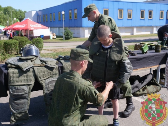 В парке экстремальных видов спорта военнослужащие подготовили для гостей праздника выставку образцов военной техники, продемонстрировали возможности беспилотных летательных аппаратов, примерили на юных патриотов противоосколочный костюм «Сокол».
