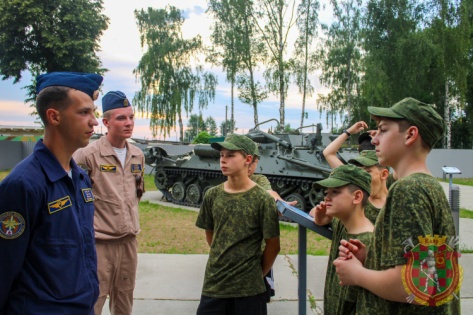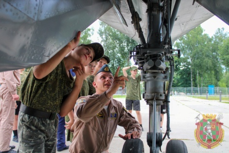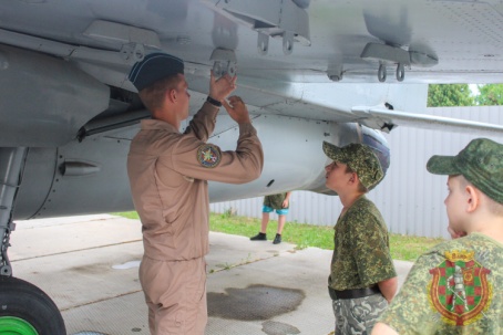 В первый день смены воспитанники лагеря ознакомились с историей полка, основными образцами стрелкового оружия, учились ходить строем. Но больше всего на них произвела встреча с курсантами авиационного факультета Военной академии Республики Беларусь. Вместе с ними школьники посетили музей воинской части. Курсантов забросали вопросами об учебе в Военной академии, о том, как стать летчиком, как поступить на авиационный факультет, что для этого требуется.