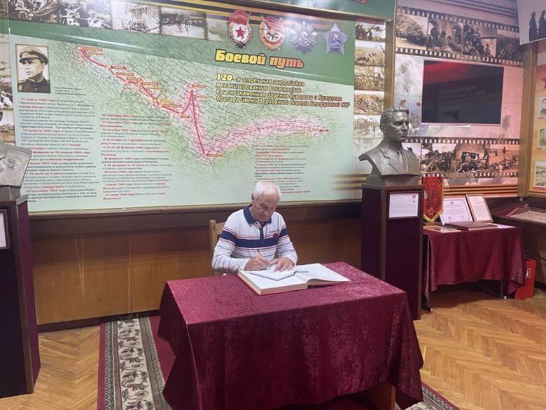 Михаил Михайлович, к слову, сам белорус, уроженец Ивацевичского района. Живет в России, но родную Беларусь посещает с радостью. Личному составу 120 омбр полковник в отставке Михаил Соломинек вручил свою книгу «Командирские решения» и оставил запись в книге почетных гостей соединения.