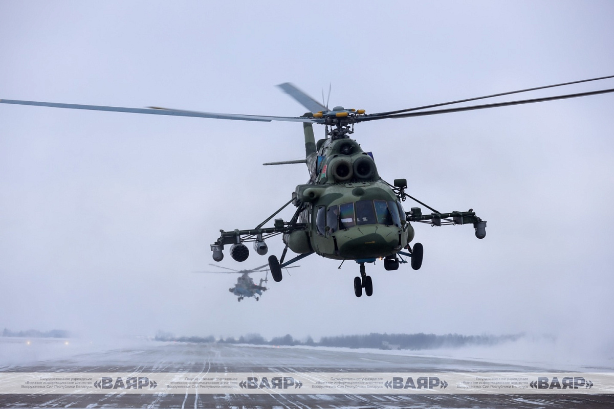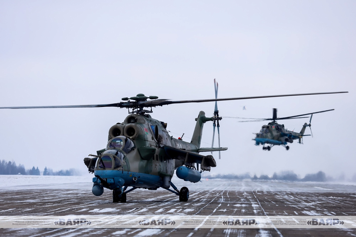 В небо поднимаются военно-транспортные вертолеты Ми-8МТВ-5, ударные Ми-24, а также новые многоцелевые ударные вертолеты Ми‑35М, поступившие на вооружение в августе этого года.