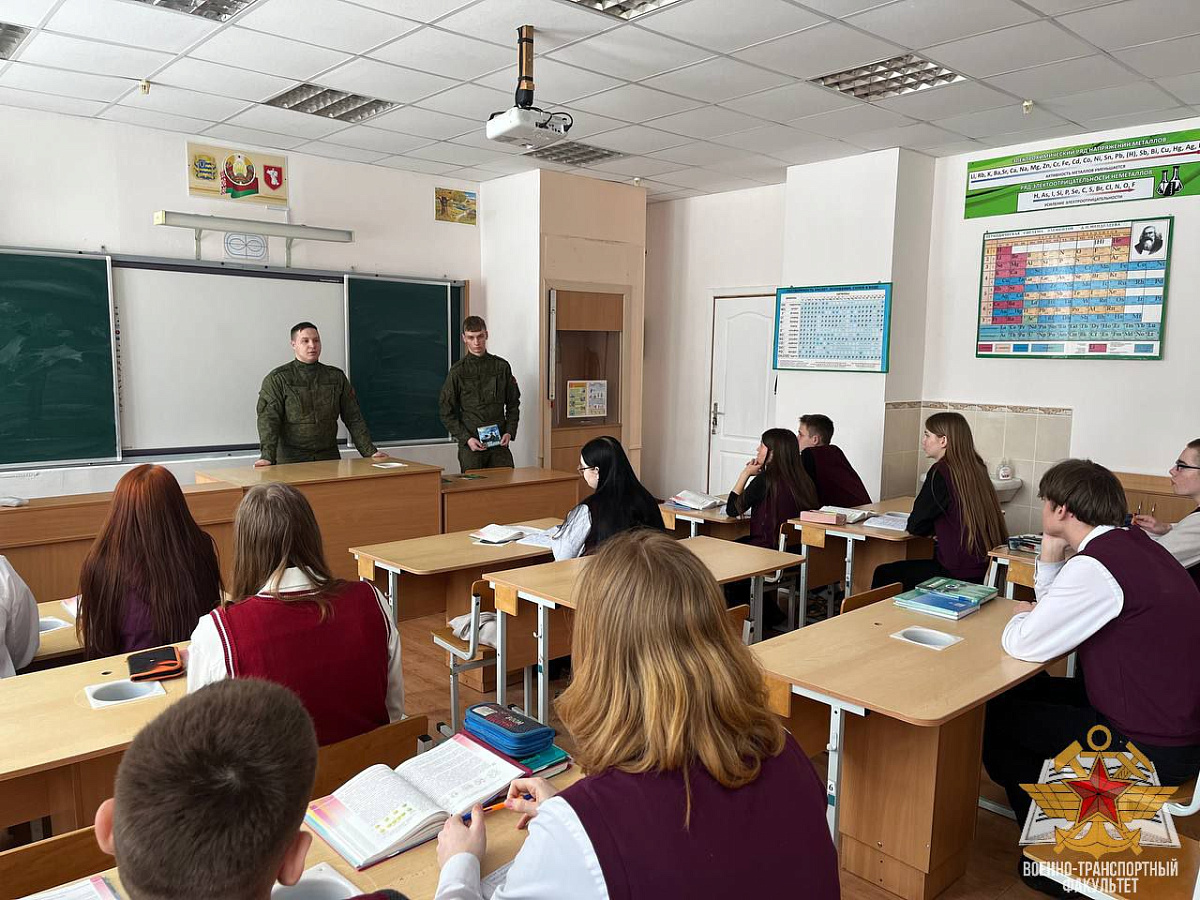 Старший преподаватель кафедры военно-специальной подготовки военно-транспортного факультета в БелГУТ подполковник Павел Кацубо совместно с курсантами Сергеем Кошелевым и Артëмом Яроцким провели профориентационную беседу с учащимися средних школ № 1, 2, 8, 9 города Жодино и Жодинского государственного лицея.