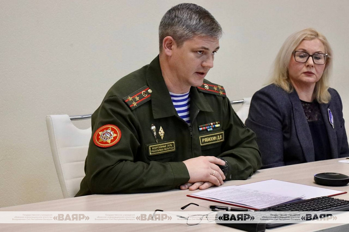 Перед участниками выступил заместитель начальника департамента — начальник 1-го управления департамента международного военного сотрудничества Министерства обороны полковник Дмитрий Рябихин на тему «Ключевые аспекты новой Военной доктрины Республики Беларусь».