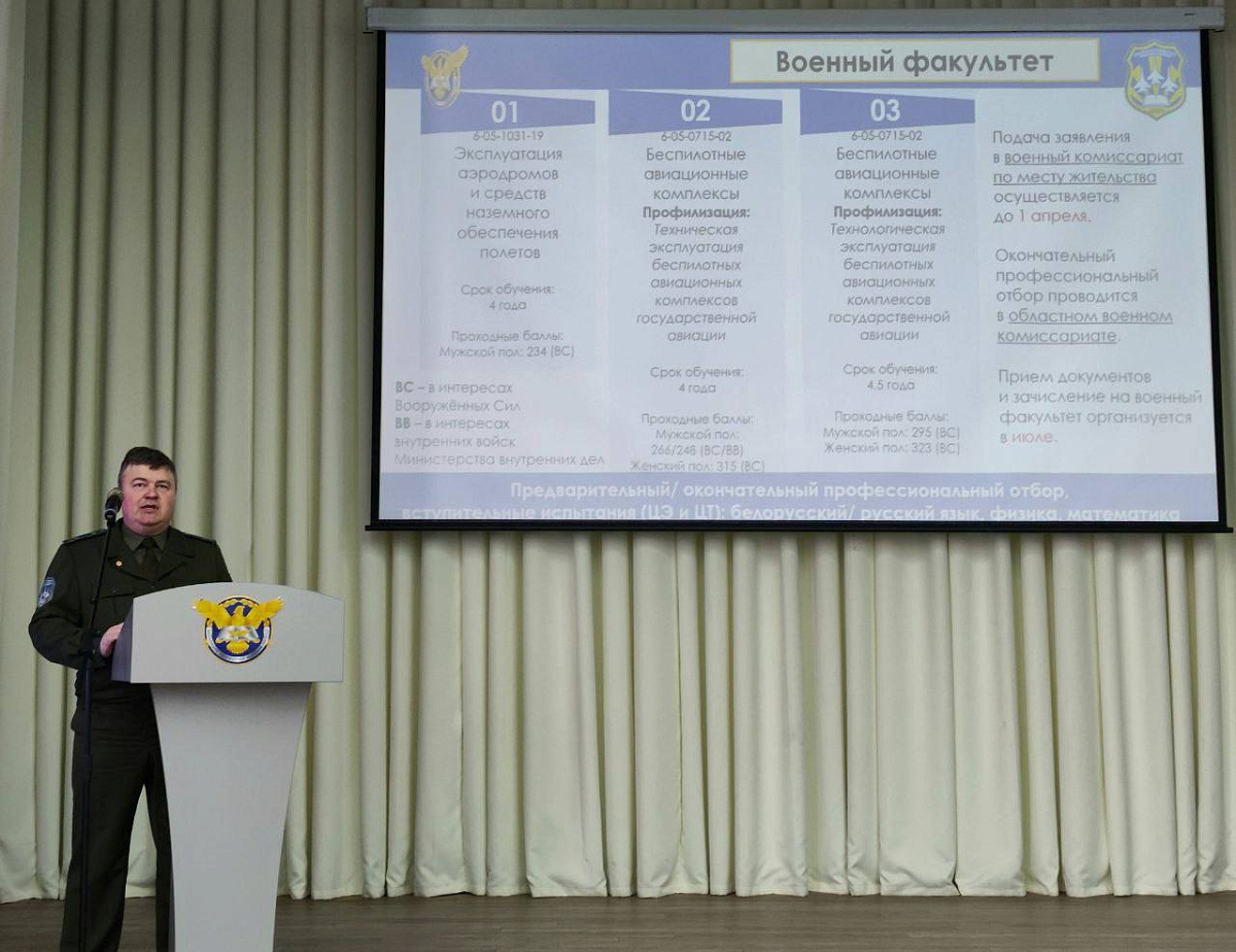 Перед гостями выступил проректор по государственной авиации — начальник военного факультета полковник Павел Примак. Он обратил внимание будущих абитуриентов на преимущества выбора профессии офицера, перспективы обучения на факультете.