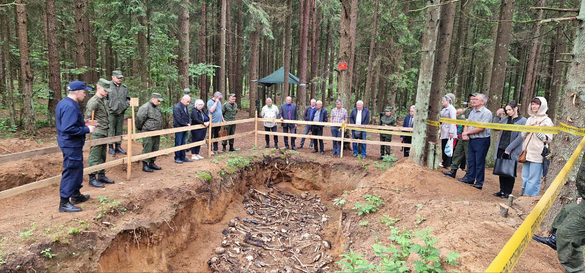 Специалисты 52-го отдельного специализированного поискового батальона продолжают работу по изъятию костных останков и других предметов из ямы-могилы времен Великой Отечественной войны.