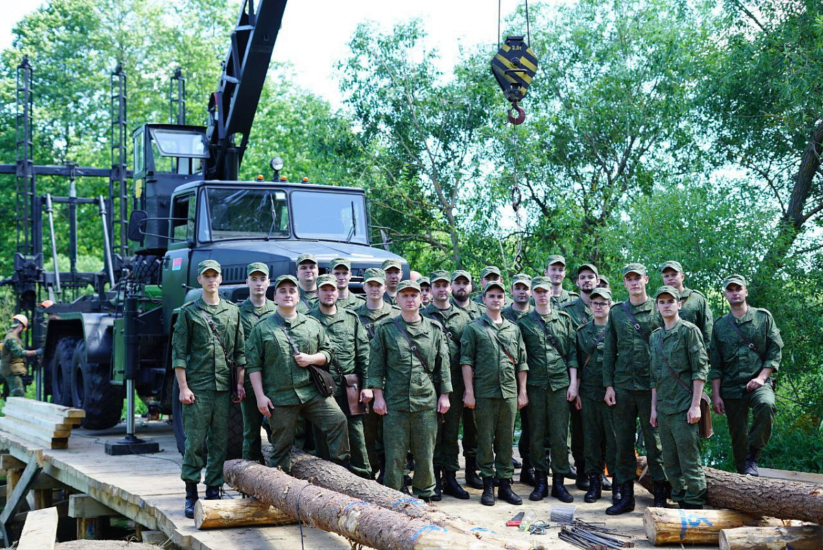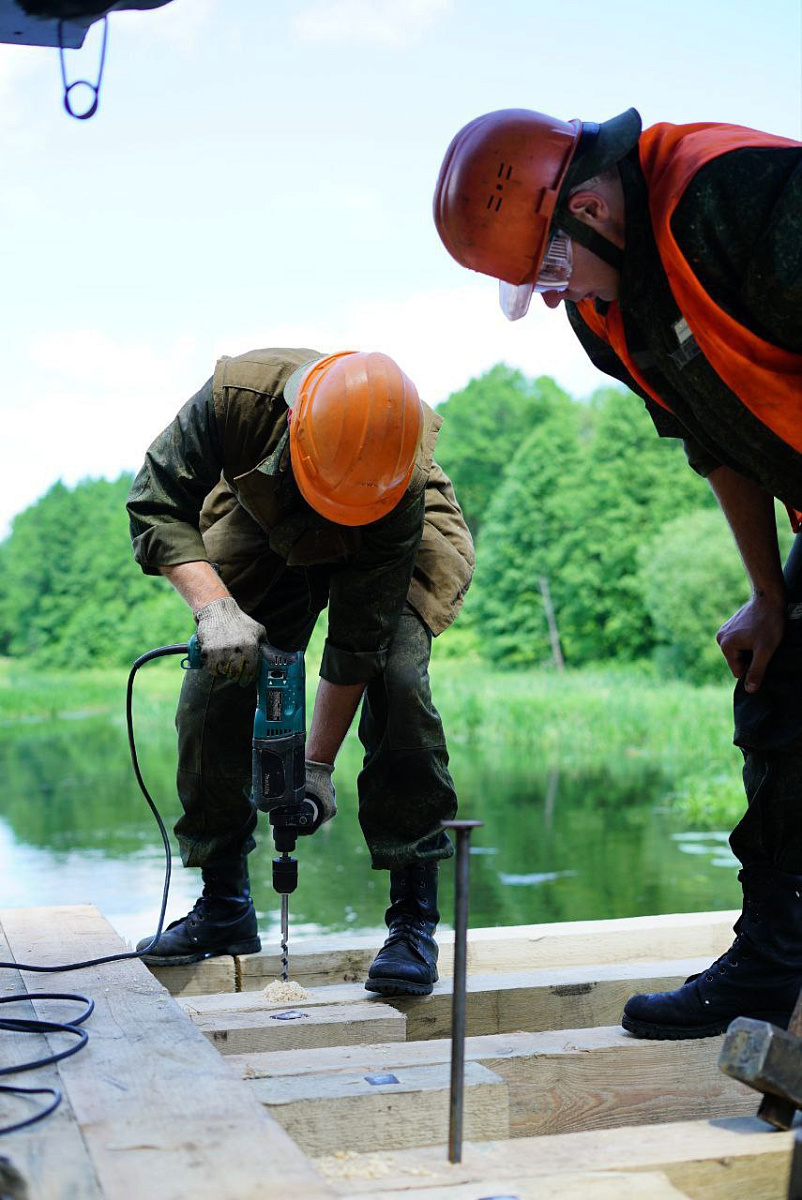 Военнослужащие прибыли в агрогородок Ухвала Крупского района на объект учебно-практических задач, где им были продемонстрированы приемы и особенности, используемые при строительстве низководного деревяного моста через реку Можа.