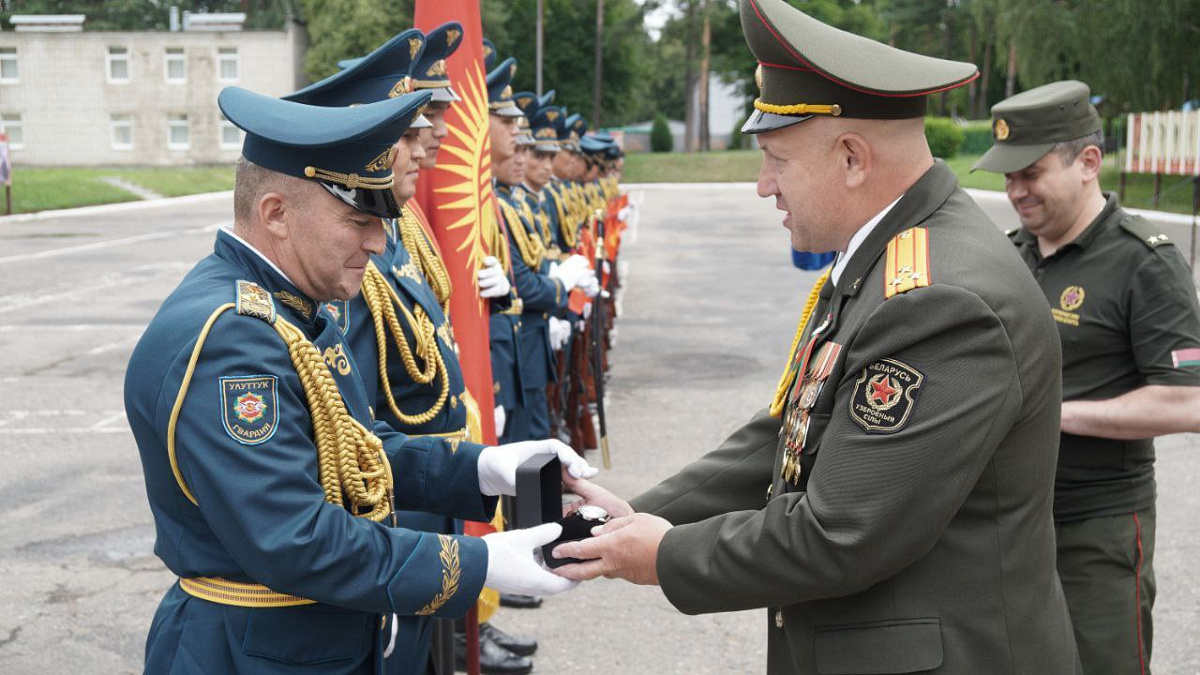 В 361-й базе охраны и обслуживания (центральных органов военного управления) начальник ракетных войск и артиллерии - начальник управления ракетных войск и артиллерии Генерального штаба Вооруженных Сил Руслан Чехов от имени Министра обороны Республики Беларусь вручил памятные подарки военнослужащим Республики Кыргызстан, которые принимали участие в военном параде, посвященном 80-летию освобождения Беларуси от немецко-фашистских захватчиков.