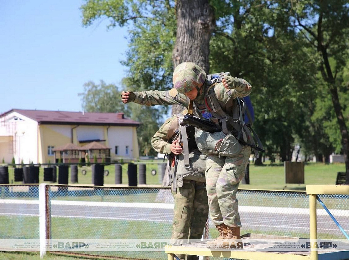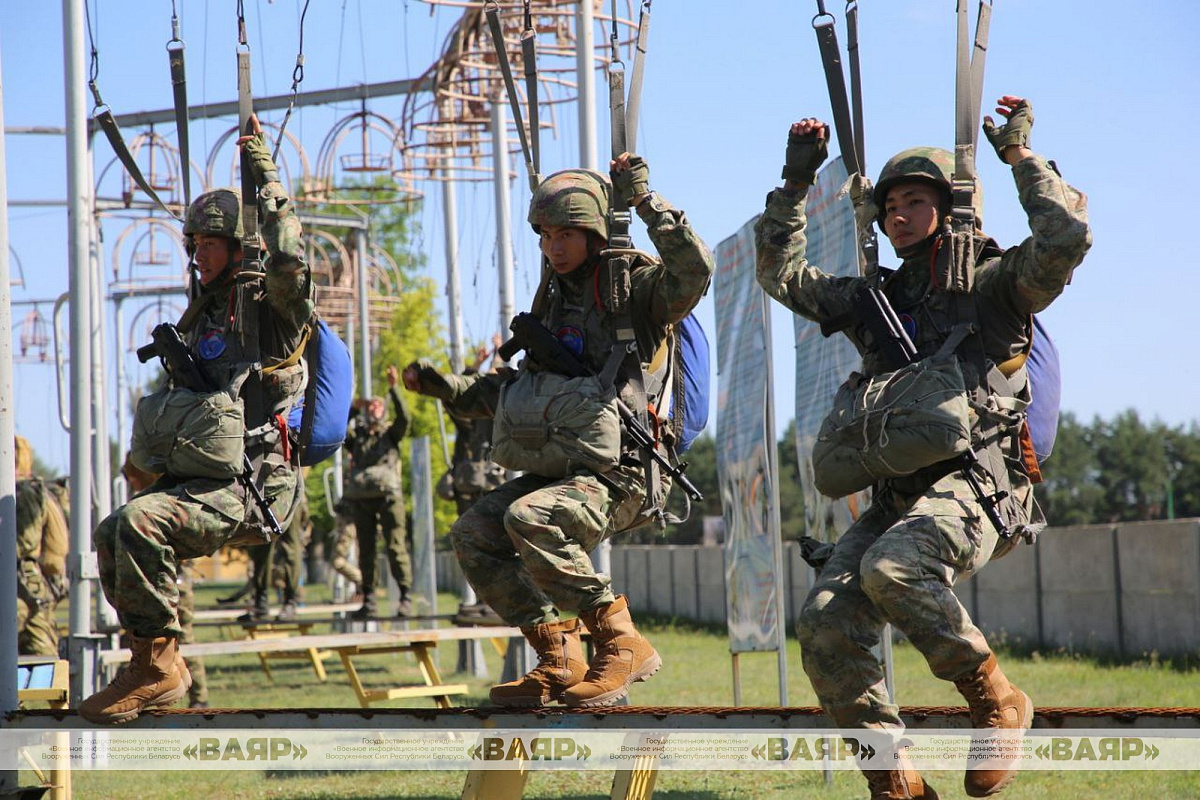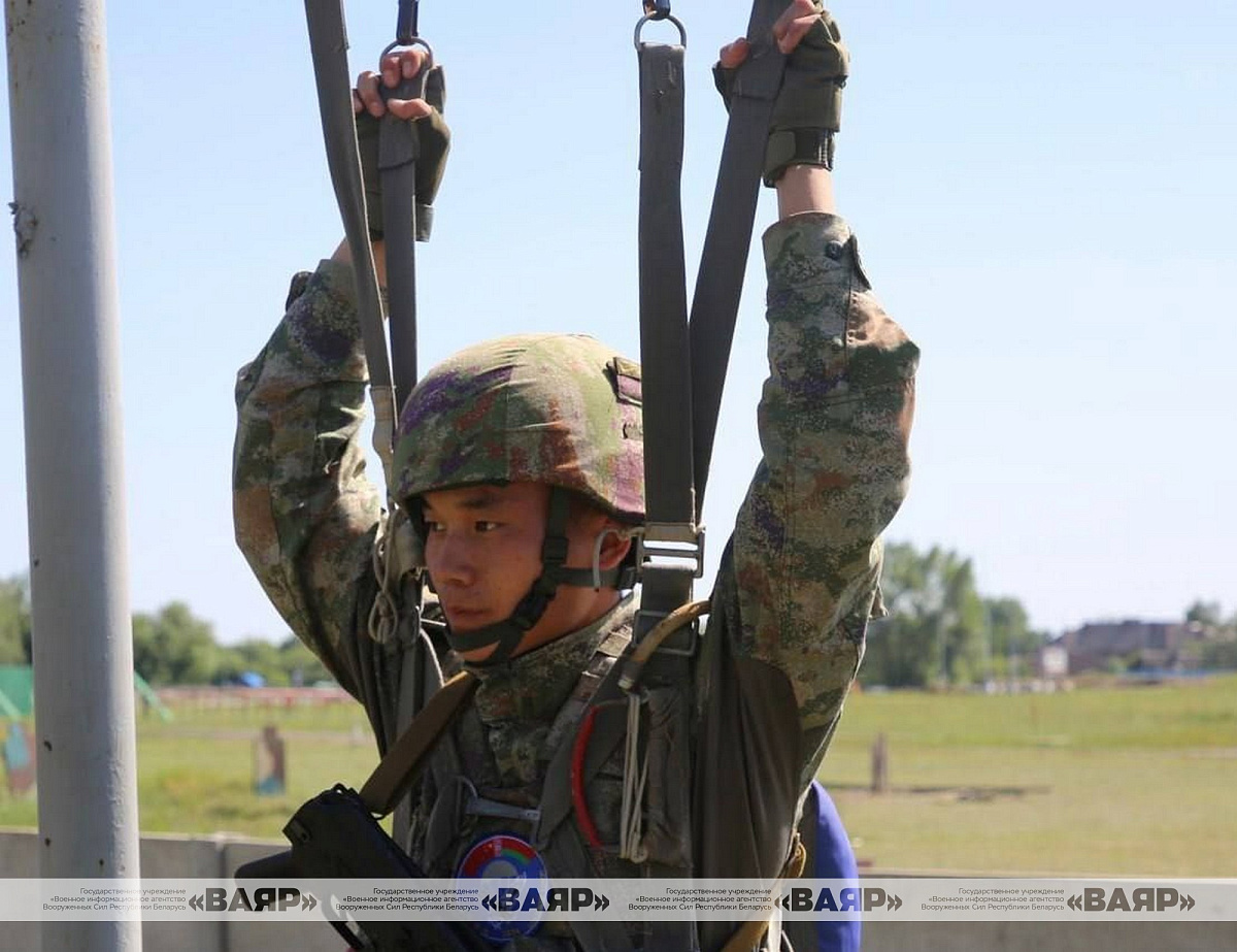 Участники совместной антитеррористической тренировки Беларуси и Китая «Атакующий сокол» отрабатывают наземные элементы прыжка с парашютом.