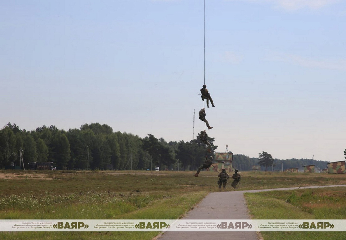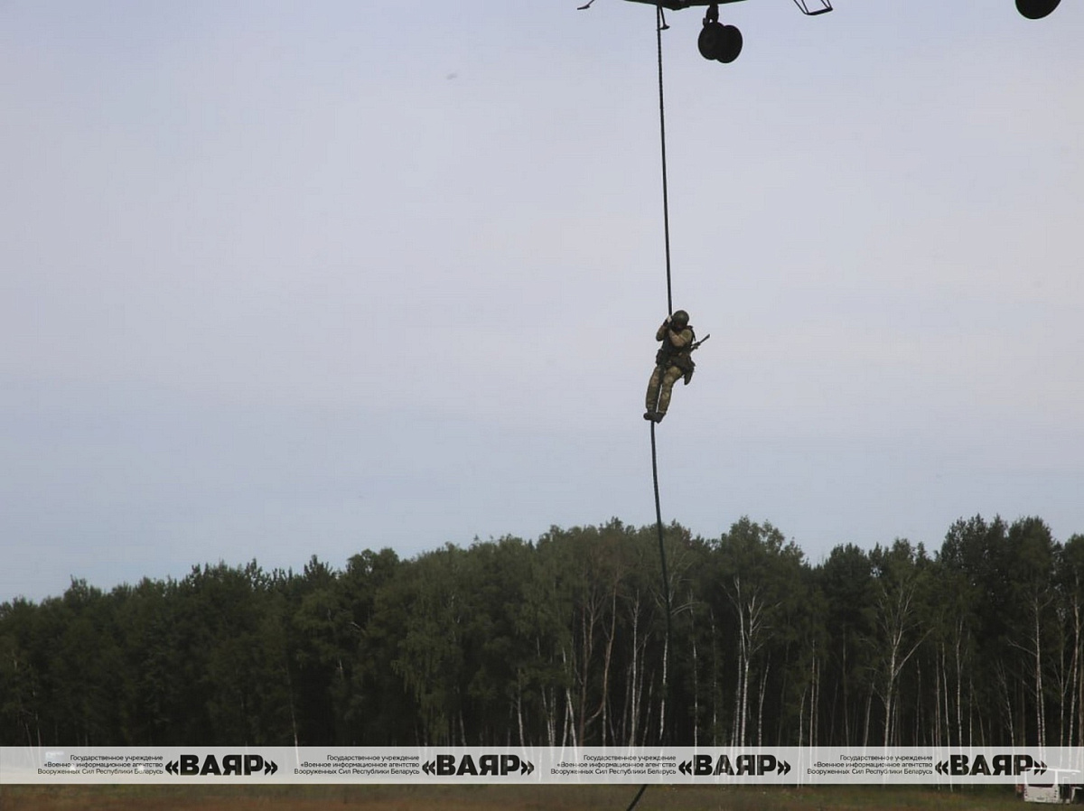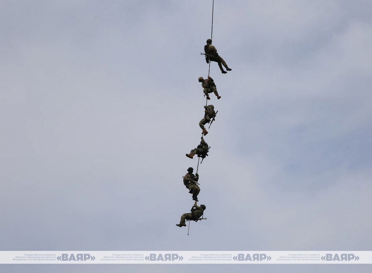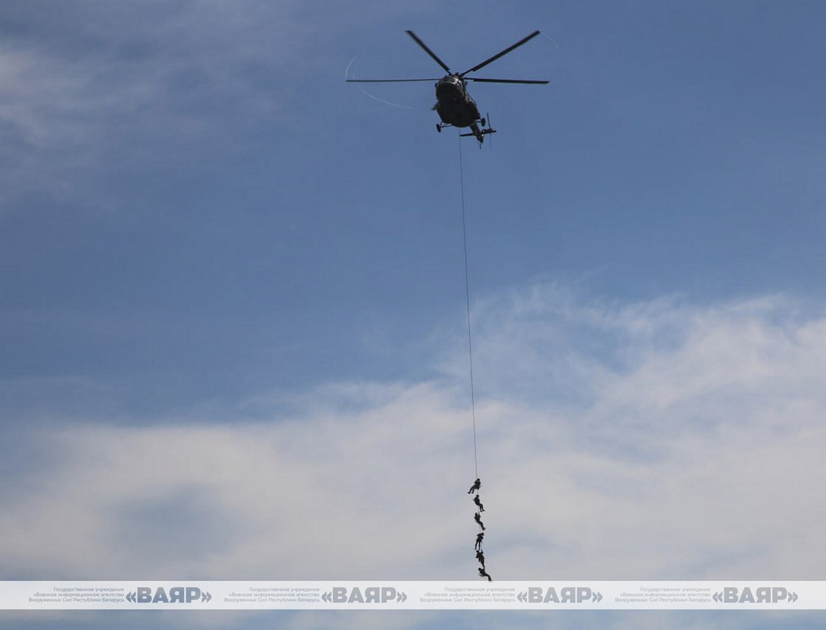 Военнослужащие Народно-освободительной армии Китая и Вооруженных Сил Республики Беларусь выполнили беспарашютное десантирование из вертолета Ми-8-МТВ-5 с использованием альпинистского снаряжения.
