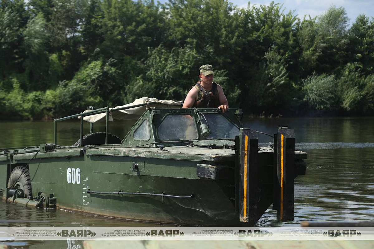 С личным составом понтонной роты проводится тактико-специальное занятие по наведению понтонной переправы на реке Днепр.