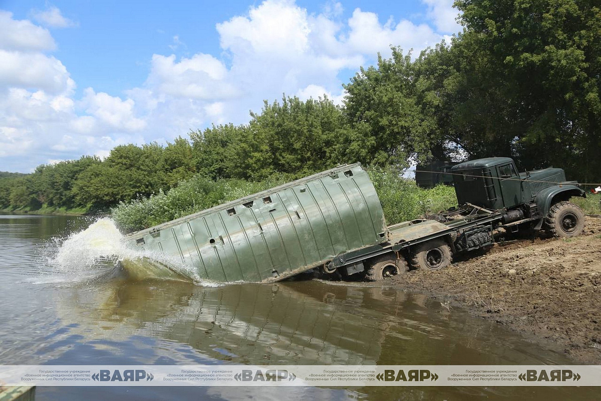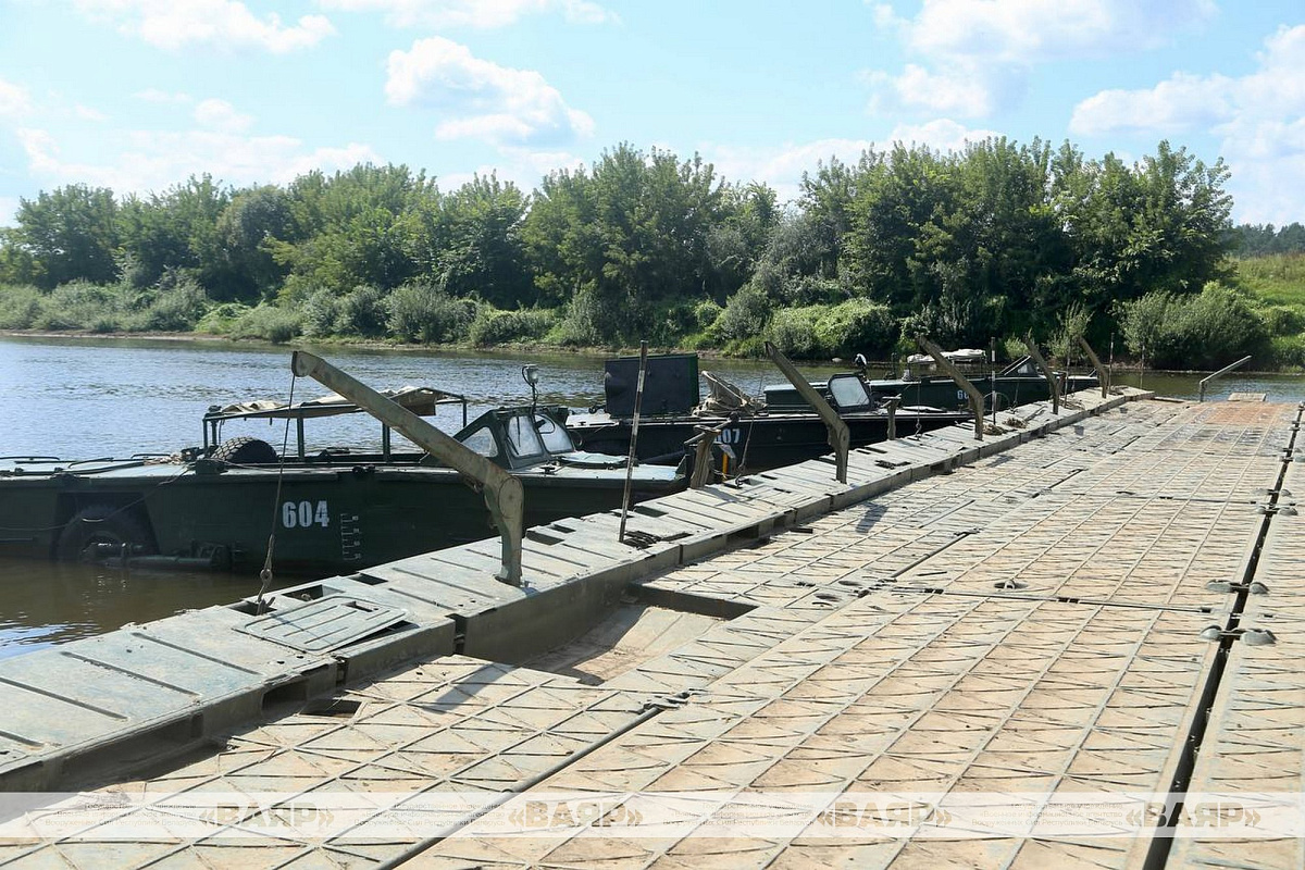 Военнослужащие понтонных подразделений частично разворачивают комплекты понтонно-мостового парка ПМП-М.