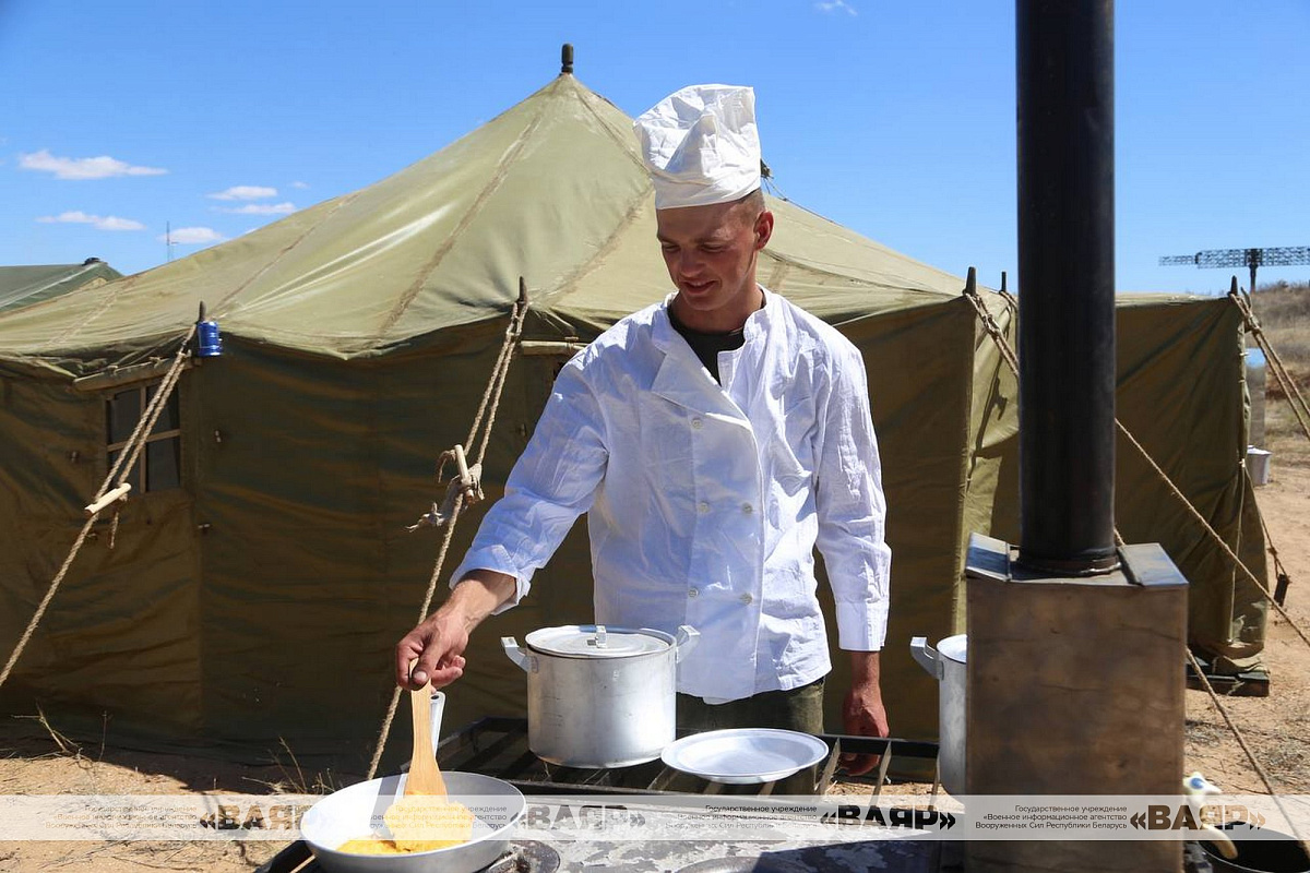 Белорусские военнослужащие, принимающие участие в совместном оперативно-тактическом учении с боевой стрельбой на территории Российской Федерации, развернули палаточный лагерь на полигоне Ашулук. В лагере есть все необходимое — полевая кухня и столовая, медицинский пункт, а также спортивный городок.
