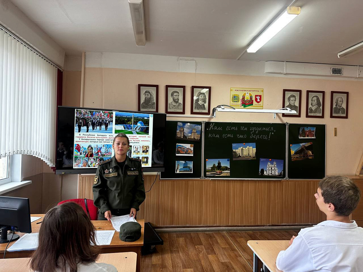 В гимназии № 1 города Жодино урок мира провела старший помощник начальника отделения идеологической работы (психолог) старший лейтенант Ольга Данькова. Перед старшеклассниками выступили и выпускники гимназии, а ныне — курсанты Военной академии Республики Беларусь и Института пограничной службы Республики Беларусь.