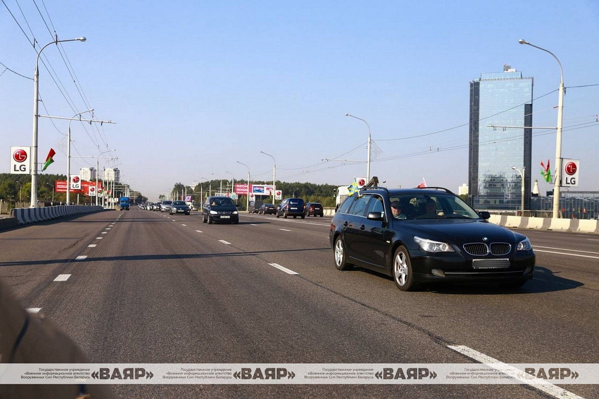 Около 40 автомобилей с государственными флагами колонной проехали по улицам столицы и ее окрестностей. В ответ военнослужащие услышали десятки звуковых сигналов автомобилей в знак солидарности от неравнодушных белорусов.
