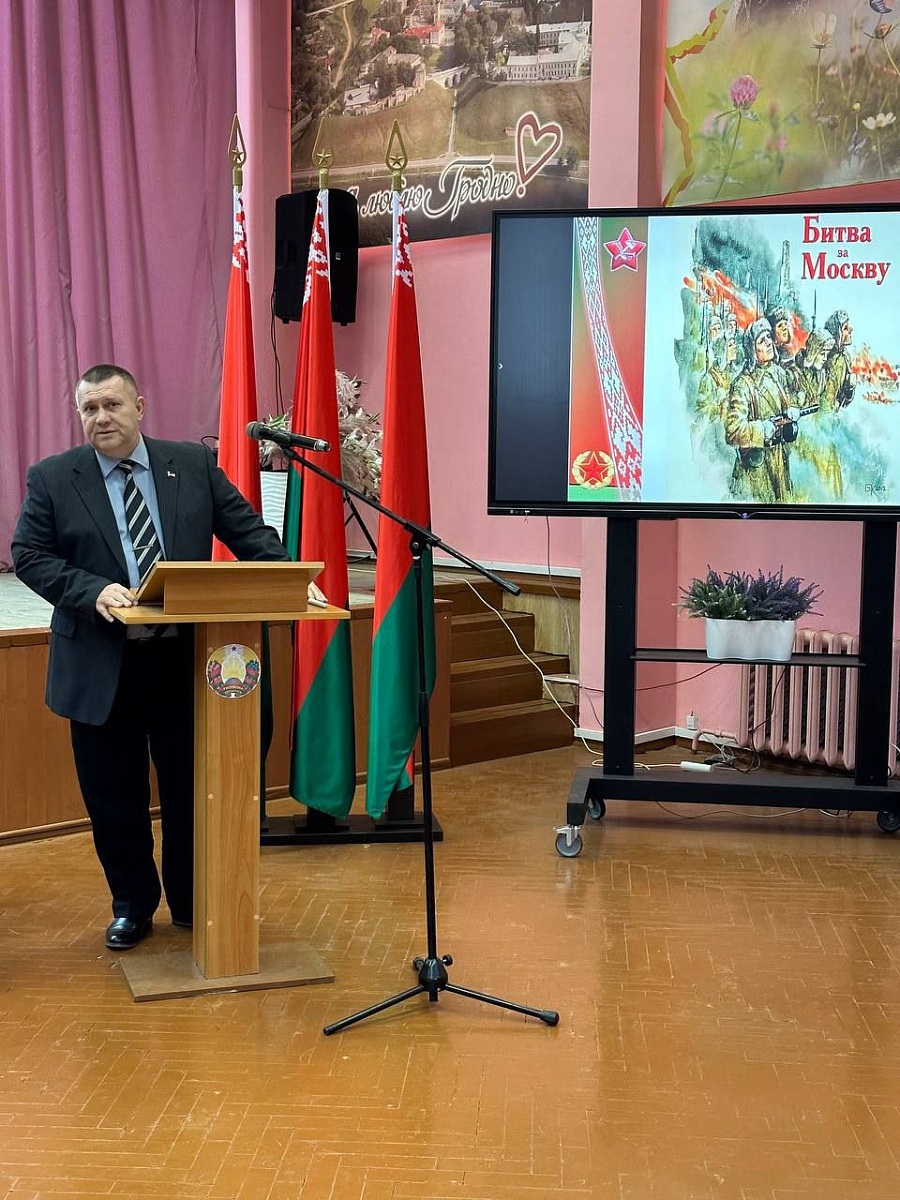 Ведущий специалист группы социальной защиты и пенсионного обеспечения военного комиссариата города Гродно и Гродненского района подполковник запаса Олег Назаров провел в гимназии № 6 имени Ф.Э. Дзержинского города Гродно урок мужества. Олег Борисович рассказал учащимся о битве за Москву.