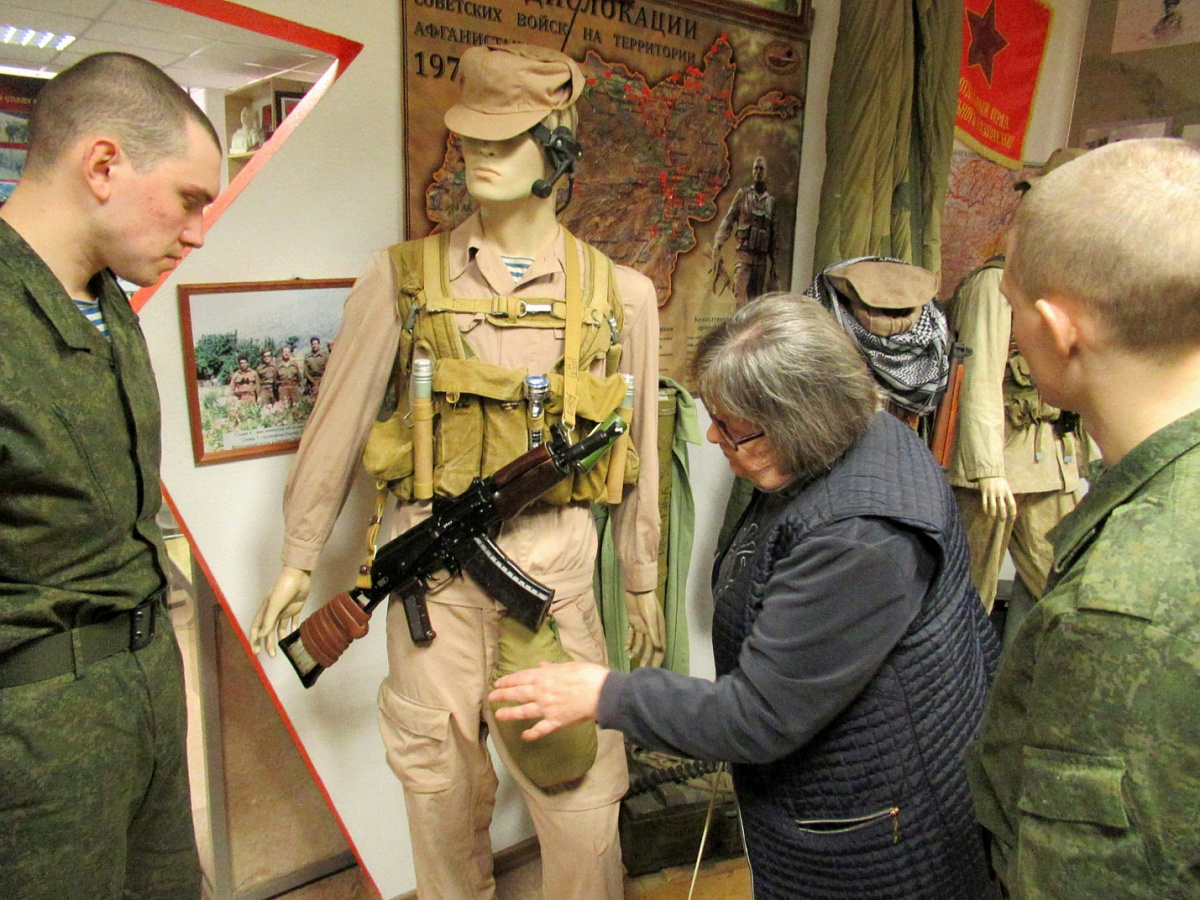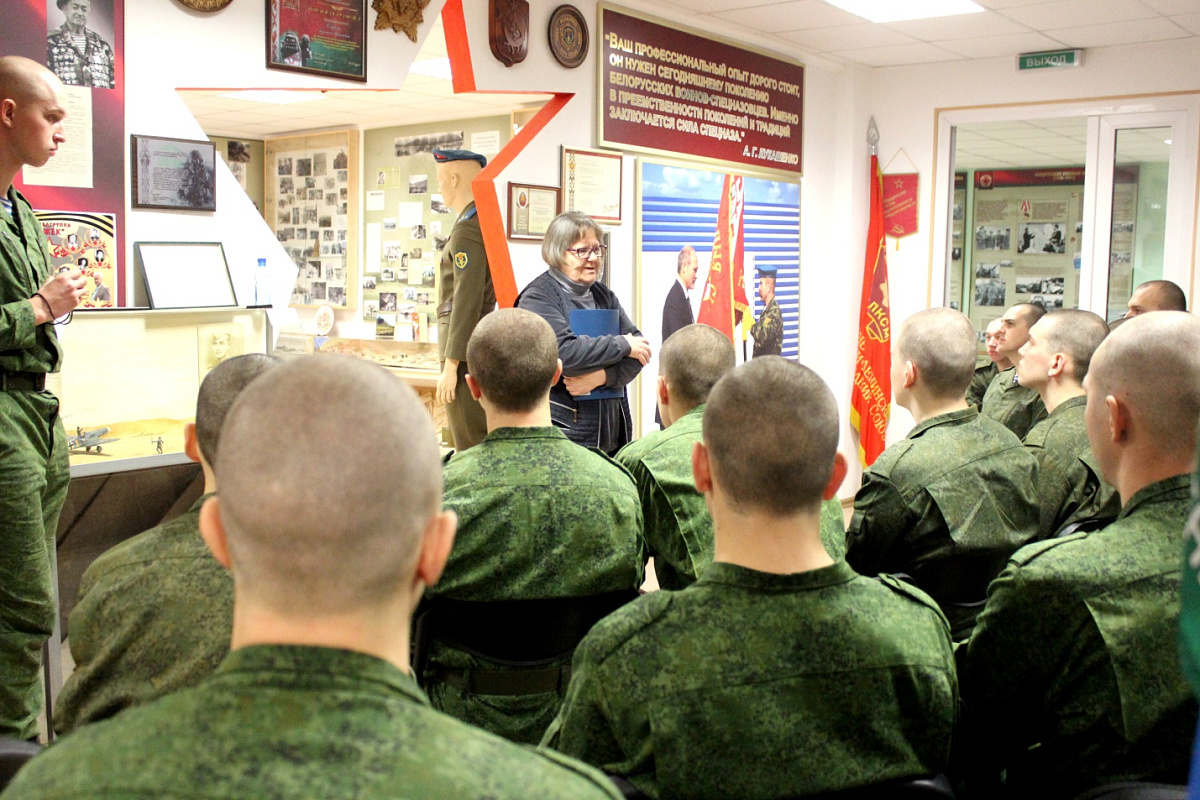 Помимо занятий по строевой подготовке, для парней организовали посещение музея боевой славы 5-й отдельной бригады специального назначения и 334-го отдельного отряда специального назначения. Экскурсию для военнослужащих нового пополнения провела Людмила Голубенко, которая не понаслышке знает, что переживали люди, выполнявшие интернациональный долг в Афганистане.