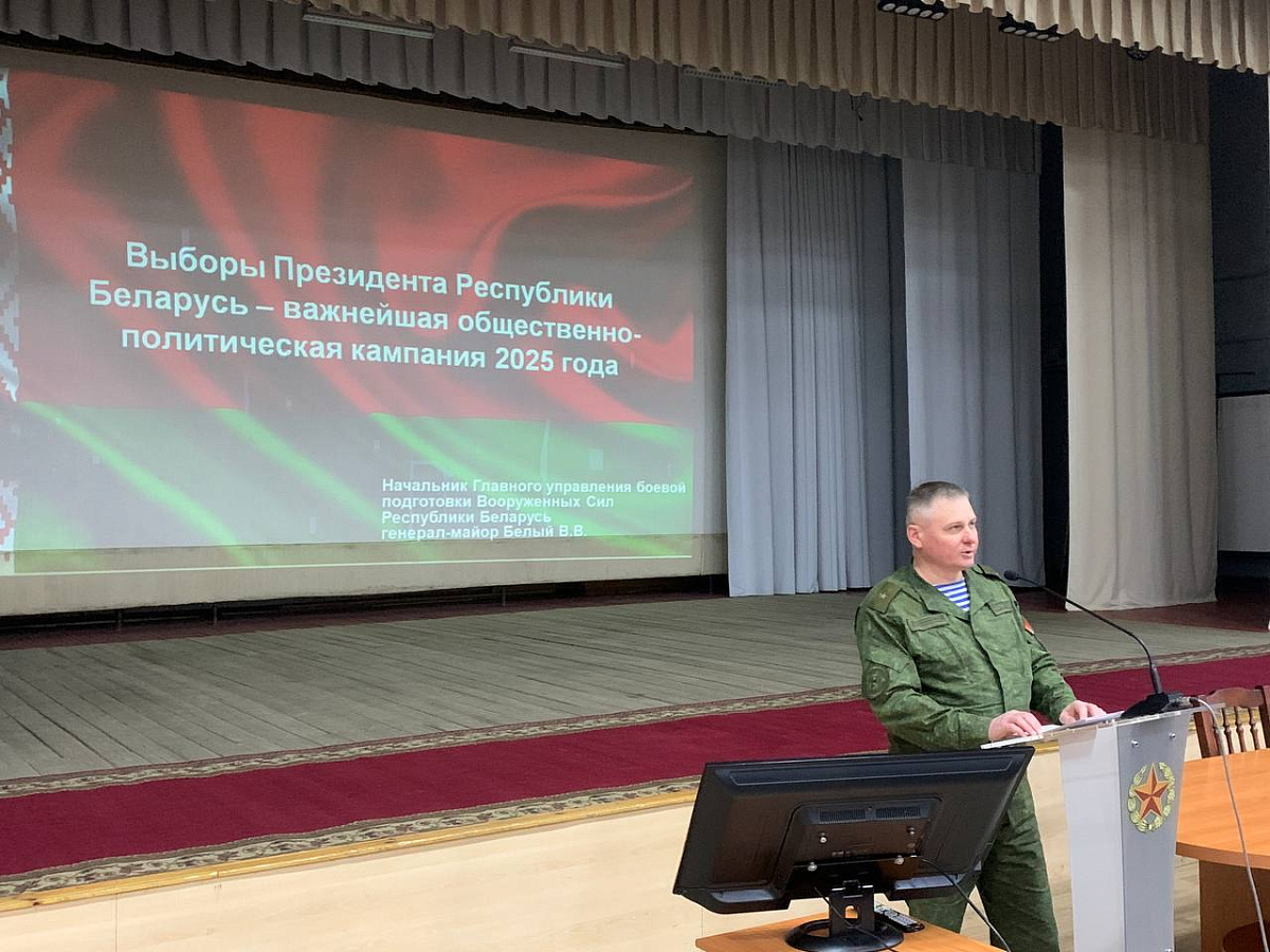 С личным составом 3-й гвардейской школы подготовки специалистов танковых и артиллерийских подразделений 72-го гвардейского Объединенного учебного центра подготовки прапорщиков и младших специалистов начальник главного управления боевой подготовки Вооруженных Сил генерал-майор Владимир Белый провел информирование по теме «Выборы Президента Республики Беларусь — важнейшая общественно-политическая кампания 2025 года».