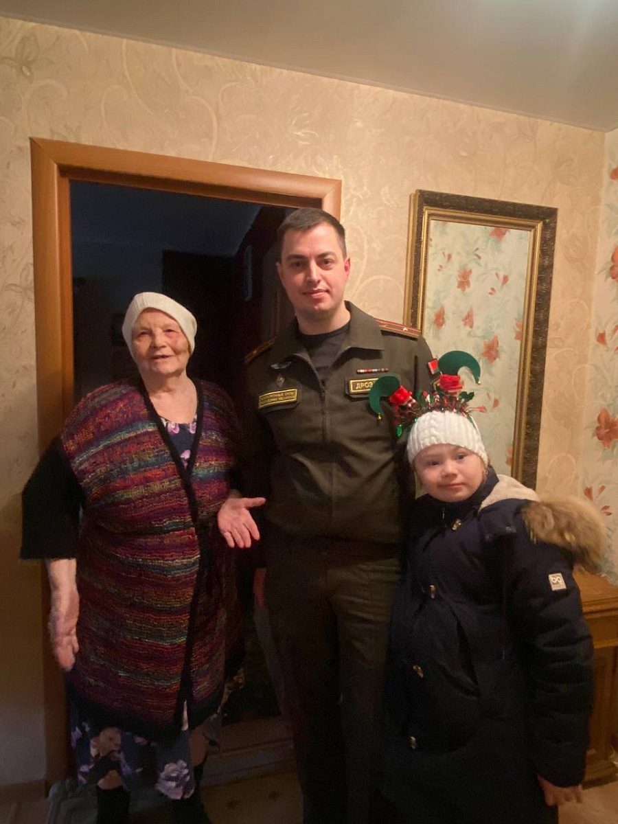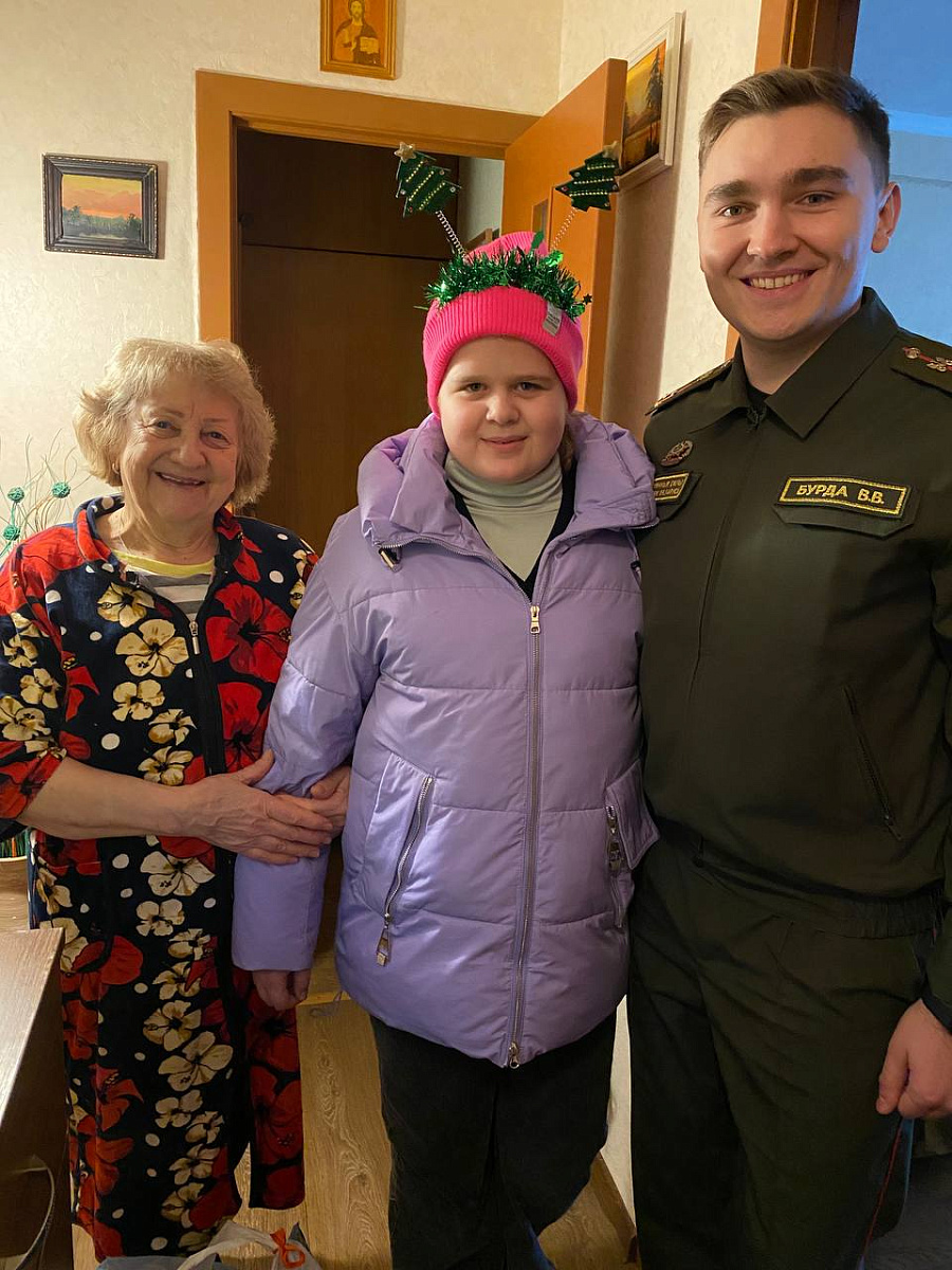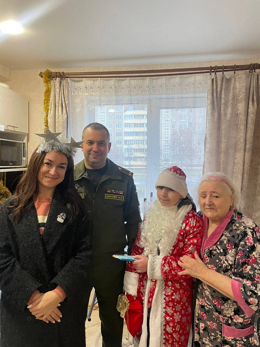 В рамках акции для пожилых людей «От всей души» военнослужащие 361-й базы охраны и обслуживания (центральных органов военного управления) совместно с учащимися и педагогами Специальной школы-интерната №10 г. Минска поздравили одиноко проживающих пожилых людей с наступающим Новым годом, вручили им подарки.
