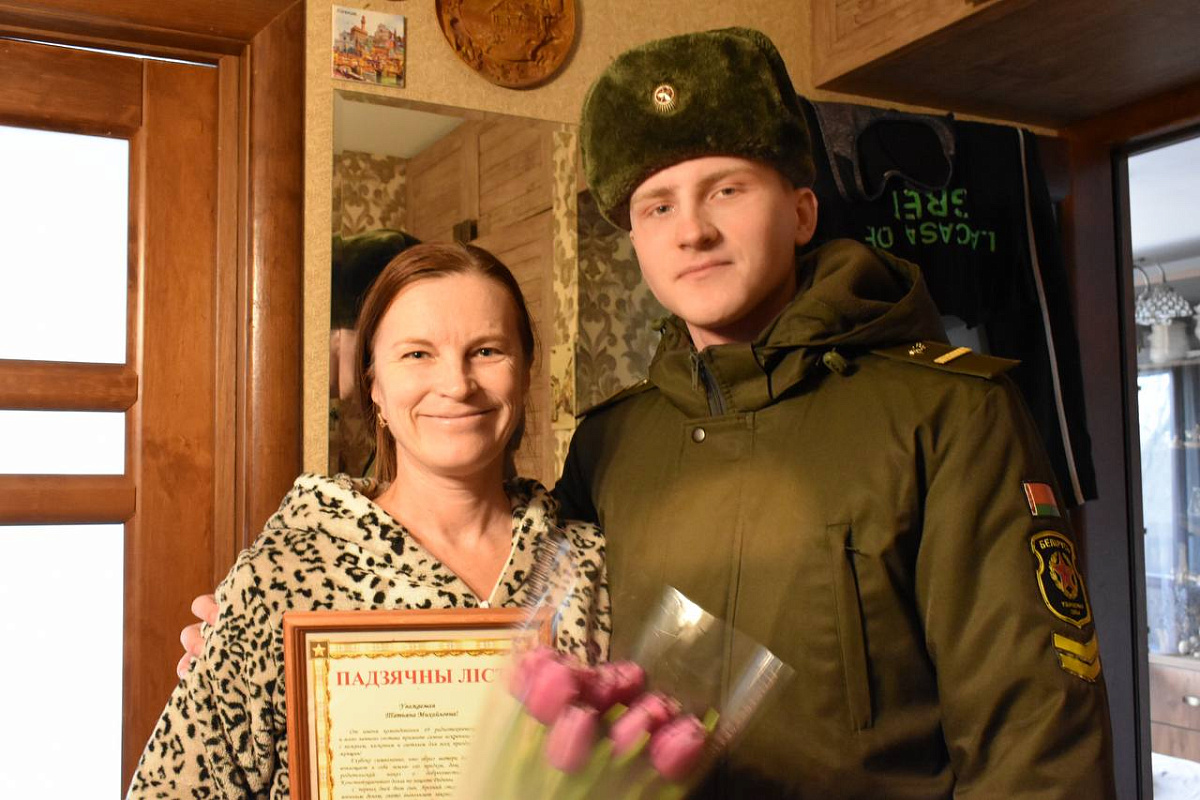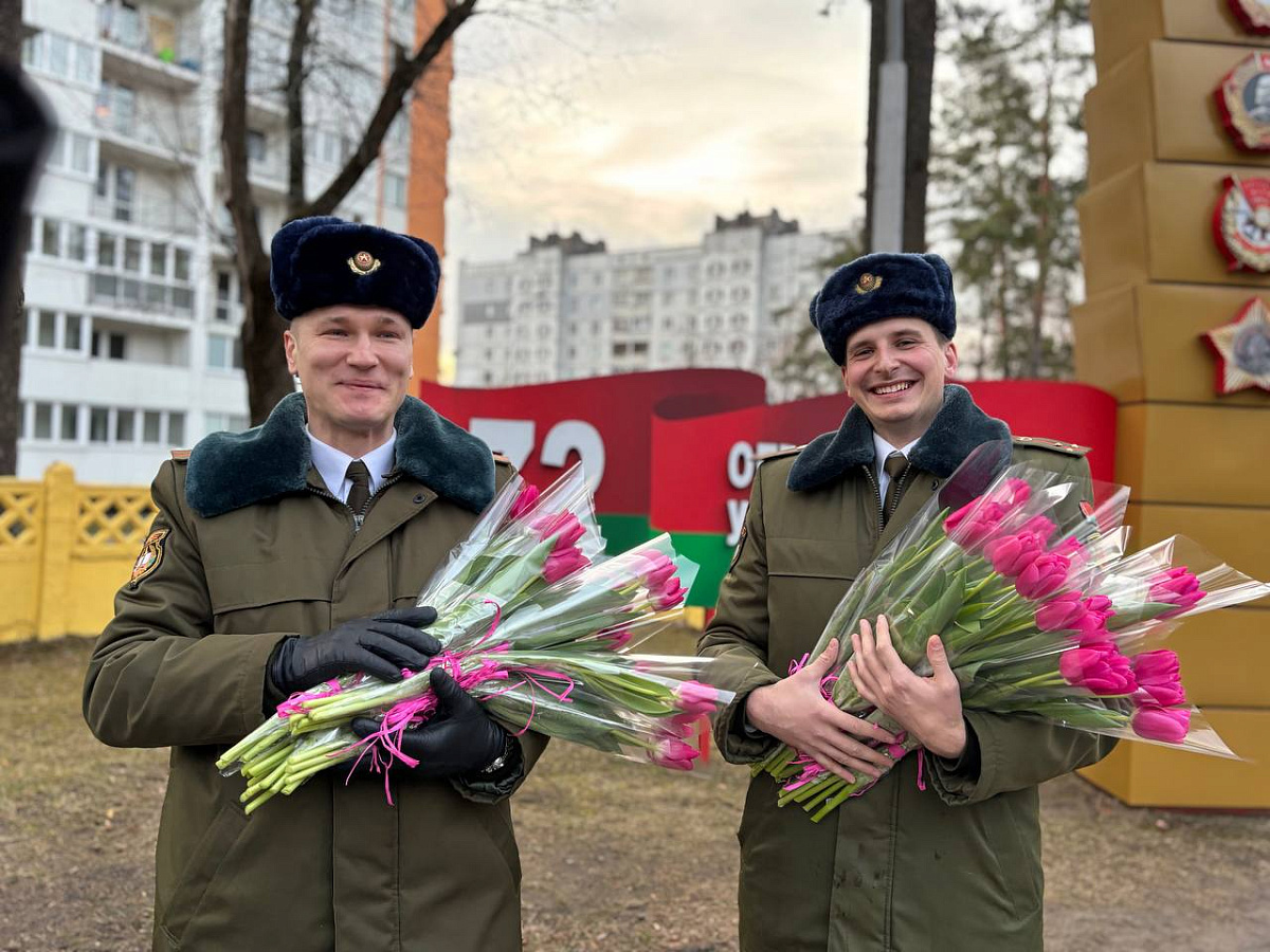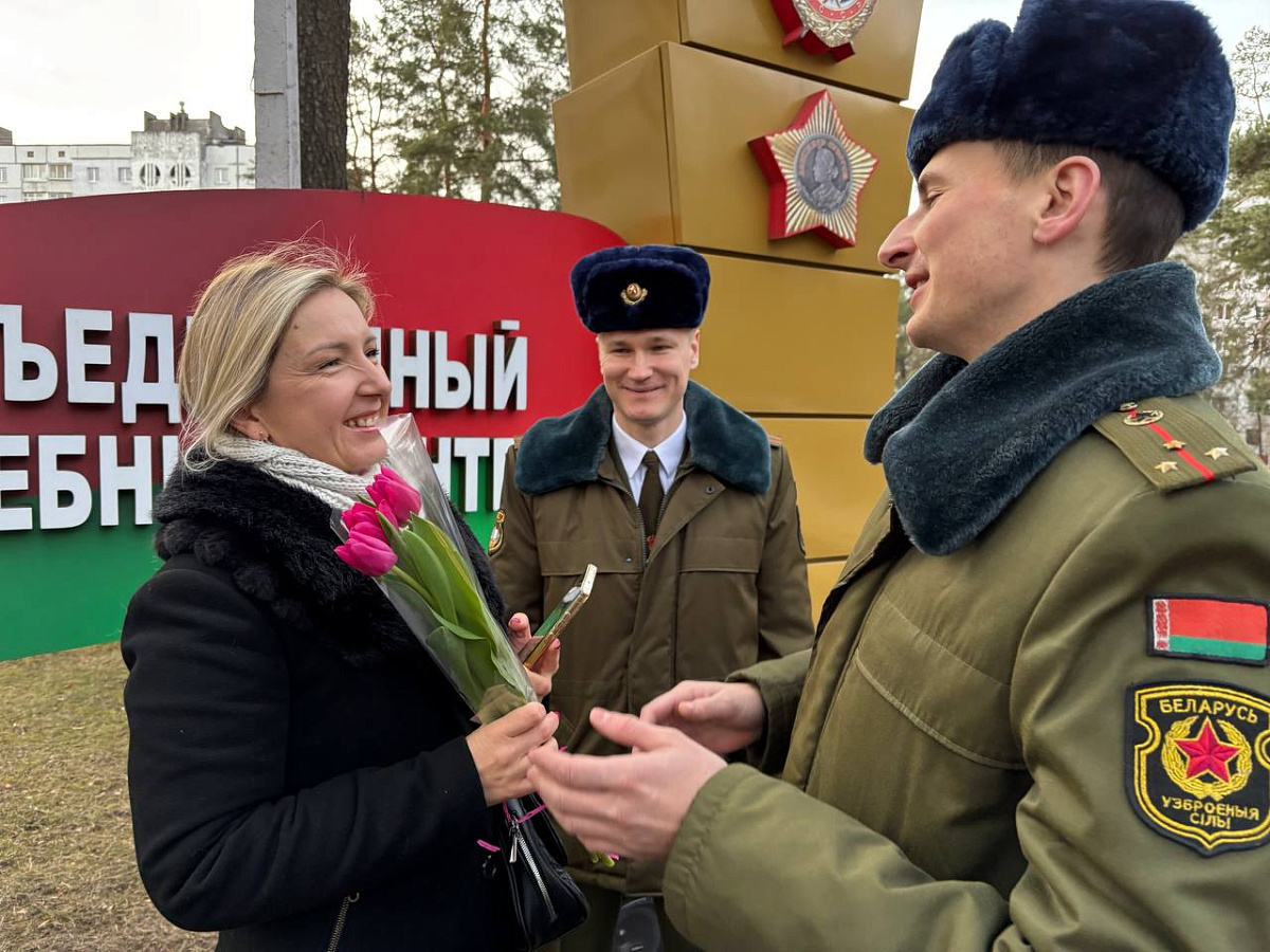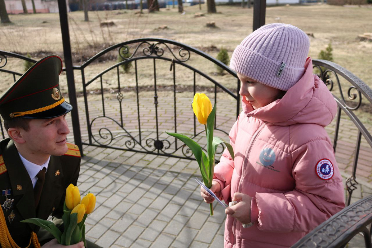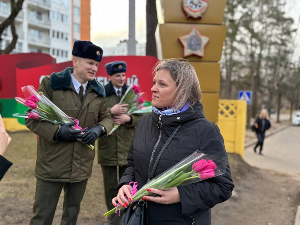 В Жодино военнослужащие 36-й дорожно-мостовой бригады провели акцию «Цветы от защитника», вручив женщинам букеты.