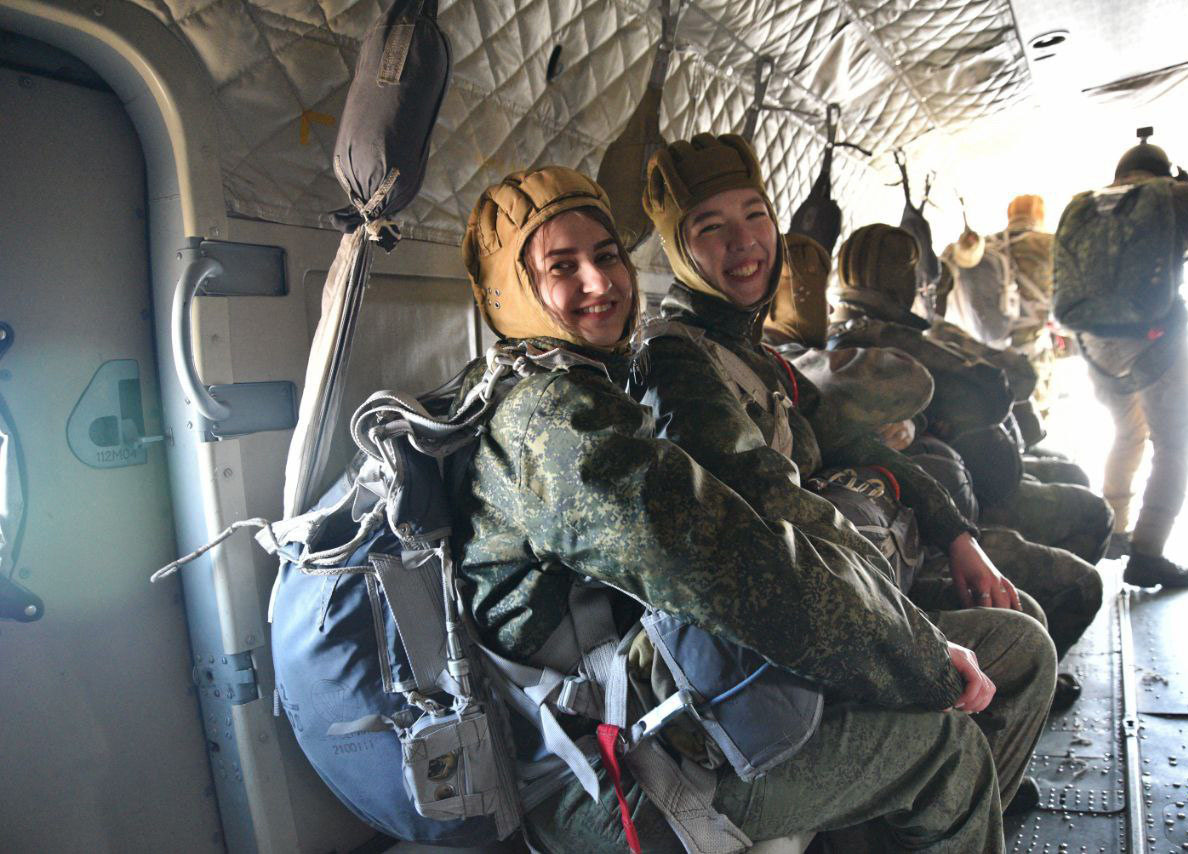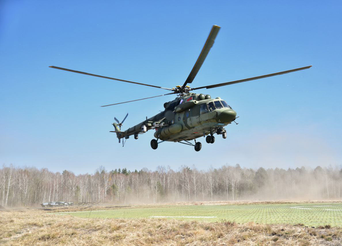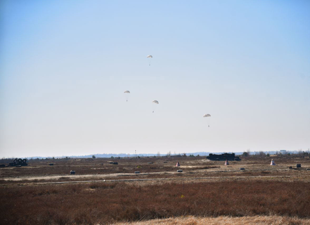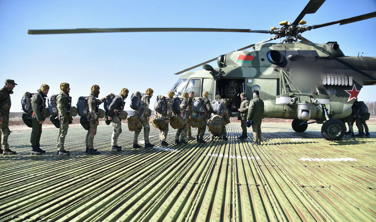 На полигоне Брестский военнослужащие 38-й Брестской отдельной гвардейской десантно-штурмовой бригады совершили прыжки с парашютом из вертолёта Ми-8МТВ‑5.
