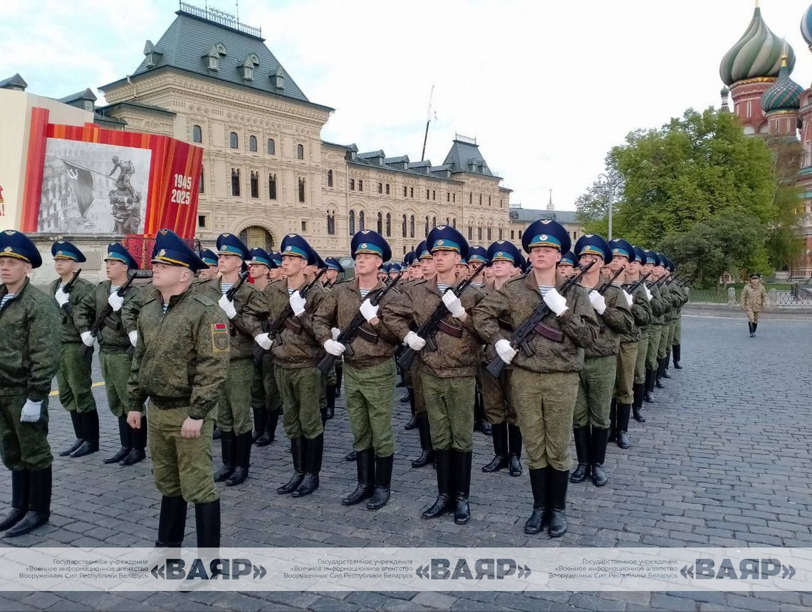 Парадный расчет сил специальных операций Вооруженных Сил Республики Беларусь чеканит шаг на Красной площади в Москве, готовясь к параду 9 Мая.