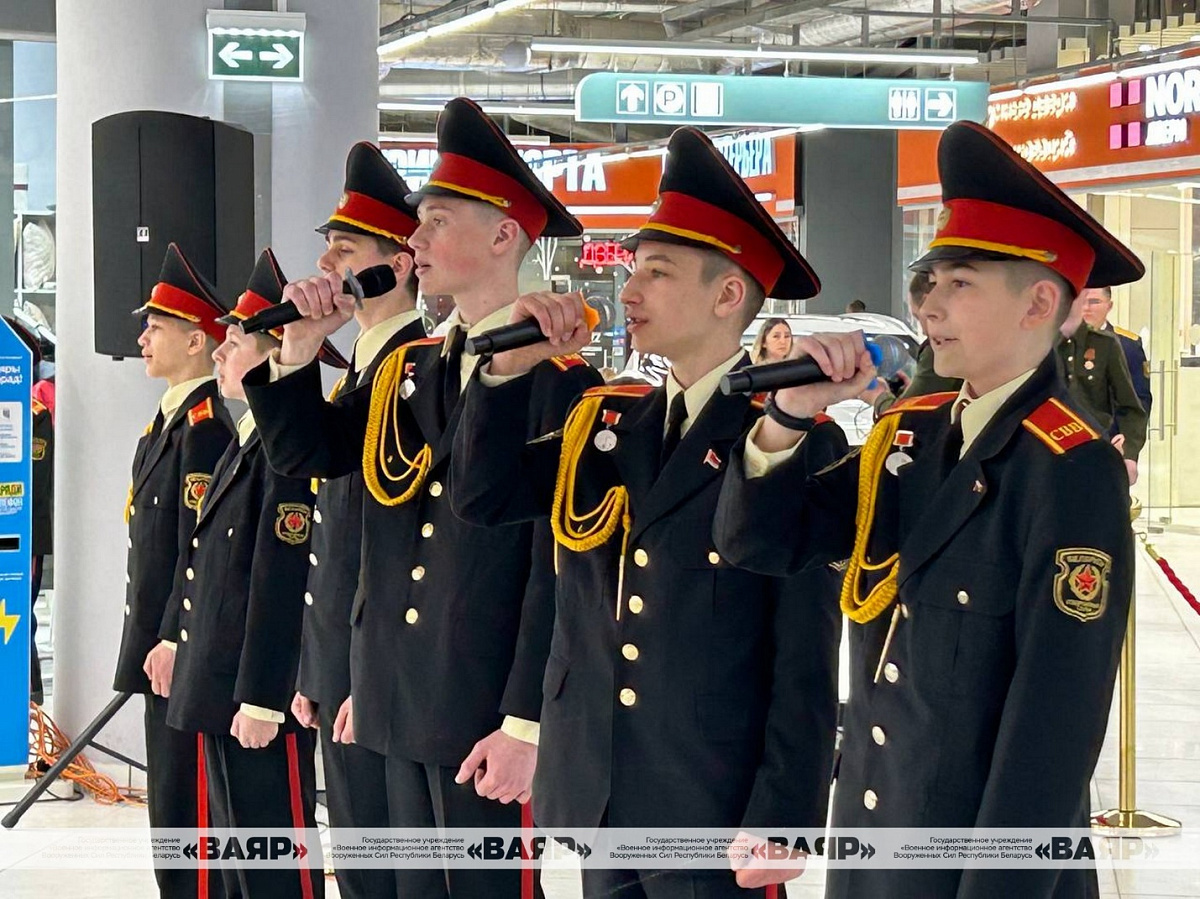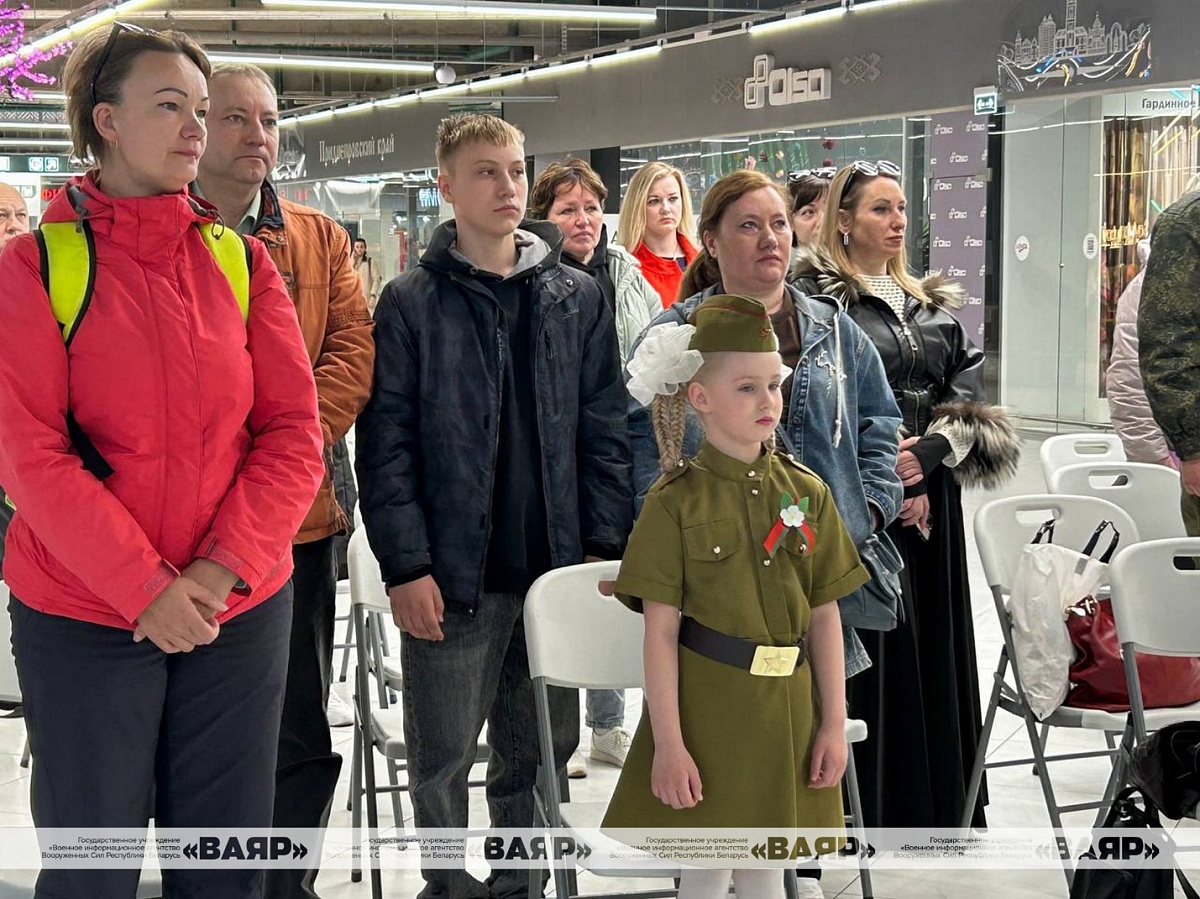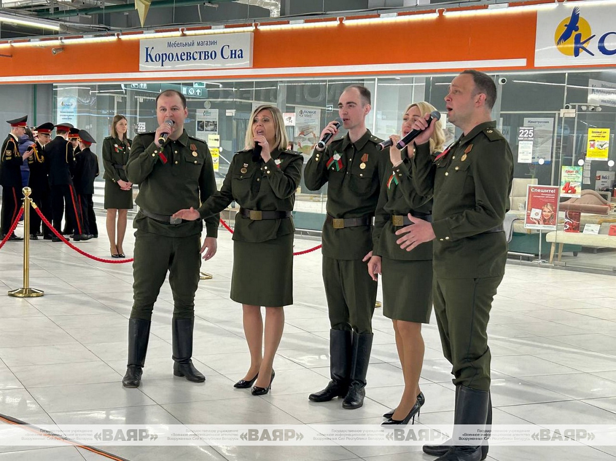 Концертную программу в День Победы для гостей ТЦ «Першы нацыянальны гандлёвы дом» подготовили музыканты народного вокального ансамбля «Концертная группа ВВС и войск ПВО», воспитанники Минского суворовского военного училища, артисты и творческие коллективы ДОСААФ и Первомайского района.