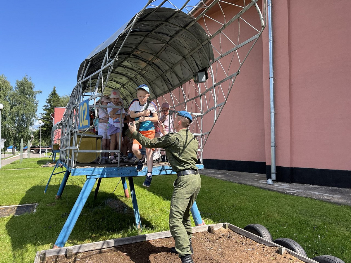 Для воспитанников школьного лагеря была проведена экскурсия по территории воинской части, включая воздушно-десантный комплекс, солдатскую казарму и комнату боевой славы.